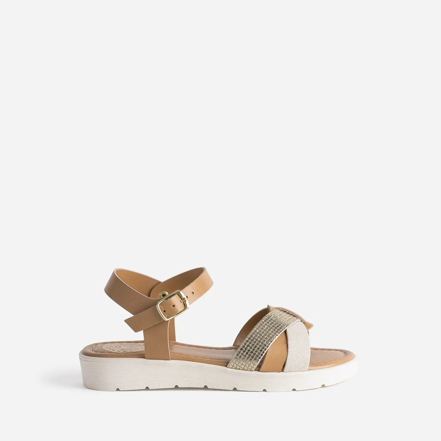 Camel et doré est un combo à ne pas négliger, notamment en été. La preuve : il sublime cette sandale pour fille, par un jeu de brides croisées sur le dessus du pied. Pour une cérémonie, comme au quotidien, elle s’accorde avec tout, avec une incroyable facilité.