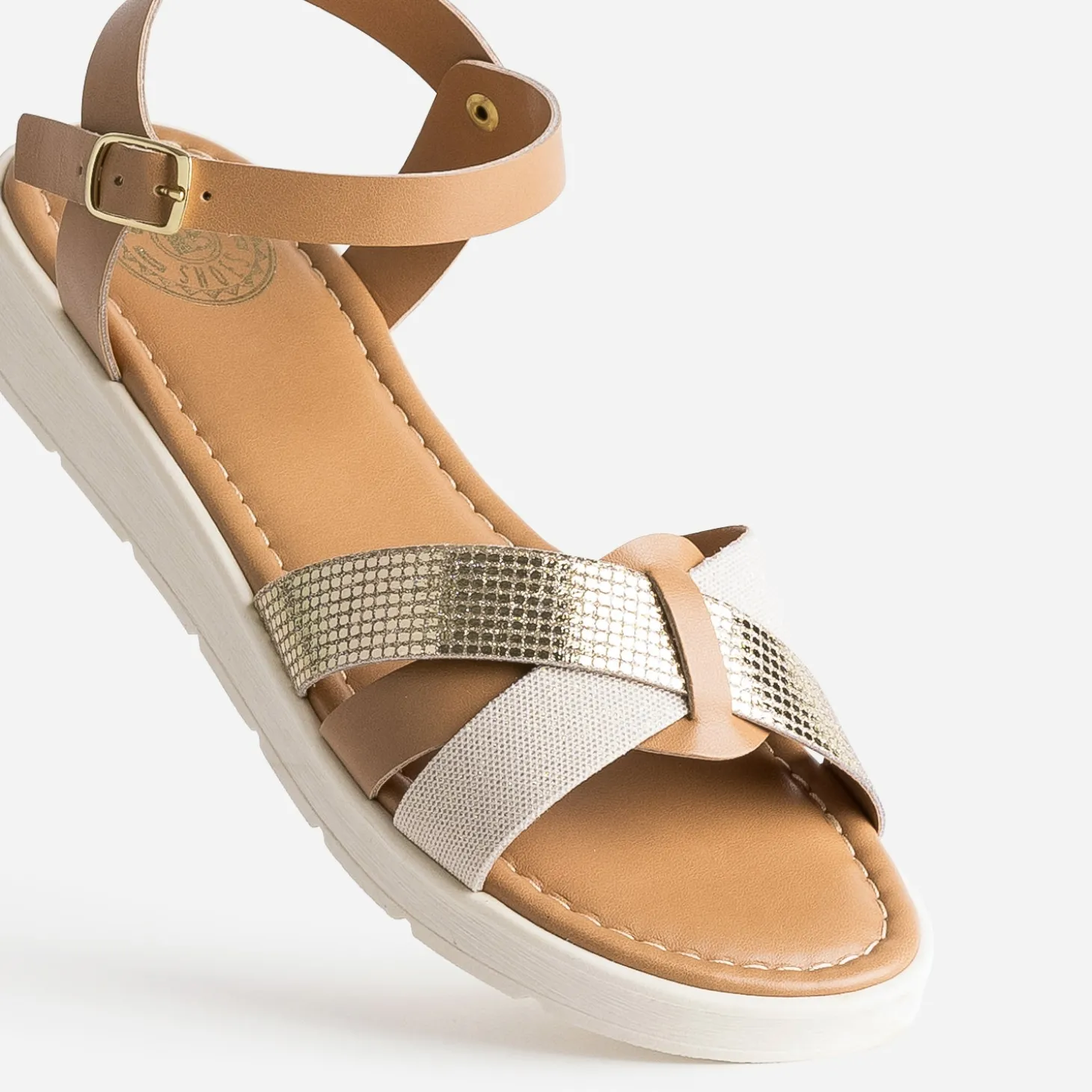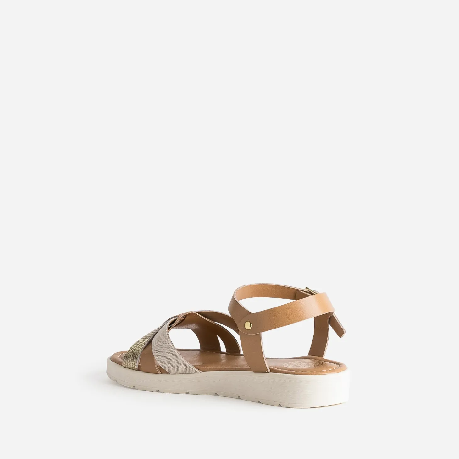 Camel et doré est un combo à ne pas négliger, notamment en été. La preuve : il sublime cette sandale pour junior fille, par un jeu de brides croisées sur le dessus du pied. Pour une cérémonie, comme au quotidien, elle s’accorde avec tout, avec une incroyable facilité.