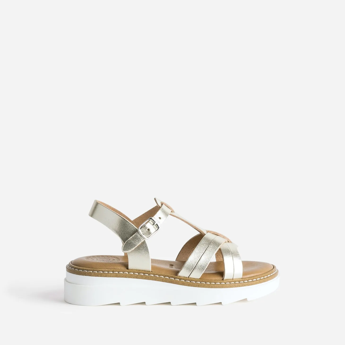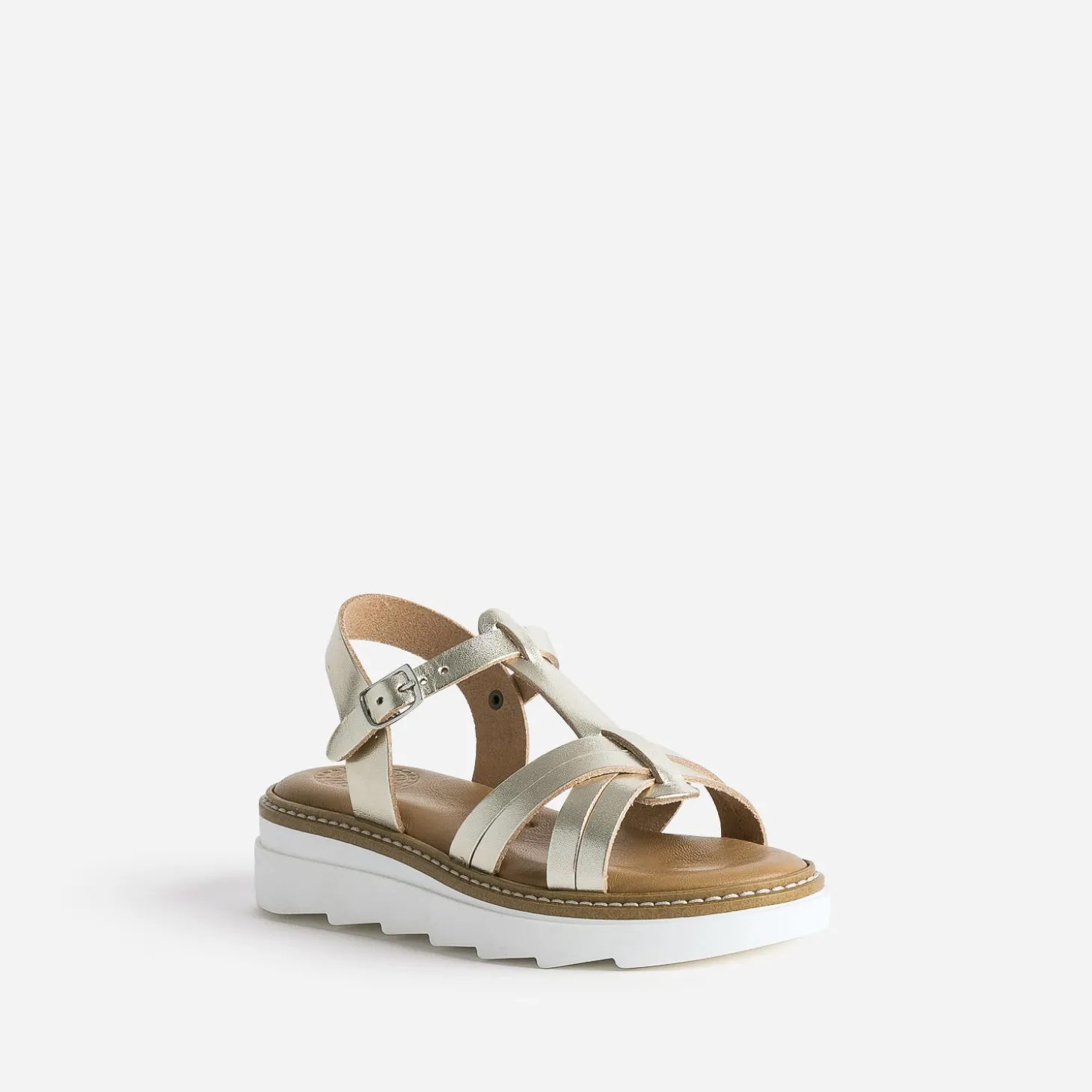 Compensée juste comme il faut (3 cm), cette sandale va séduire les petites filles. En cuir lisse, elle opte pour un coloris doré sur les brides et la semelle extérieure ; une semelle crantée pour une meilleure adhérence. A l’intérieur, la semelle première est moussée pour un confort inégalé. Un modèle à associer avec un combi-short en jean bleu ou bien un look graphique en duo de noir et blanc.