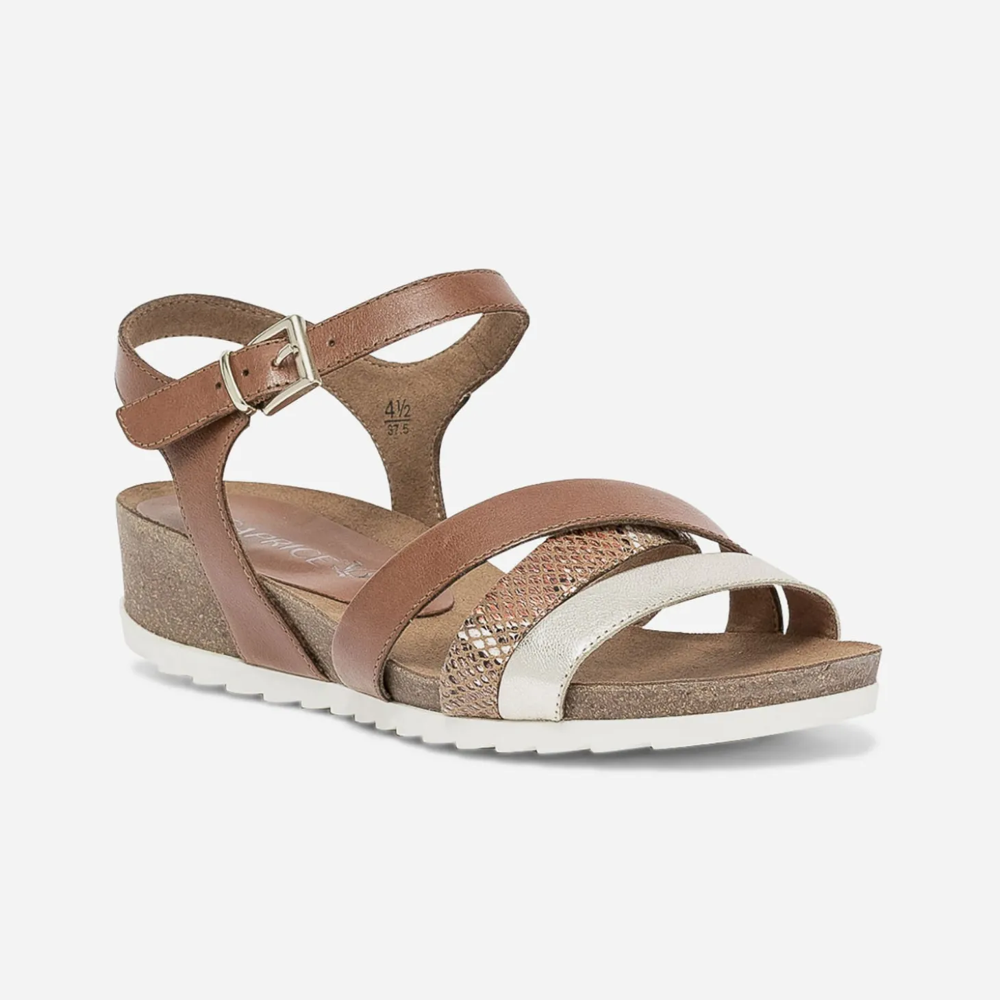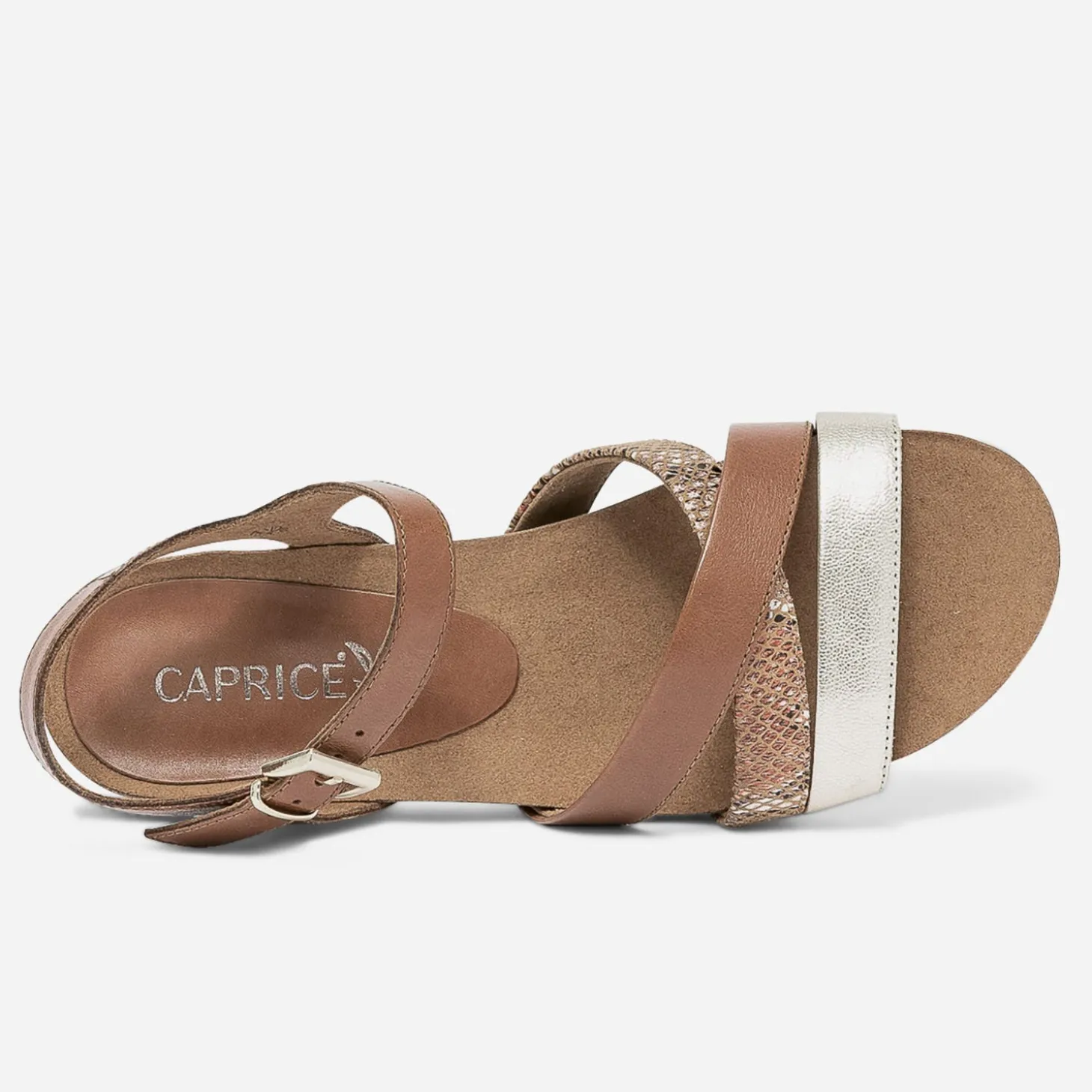 Spécialiste du bien-être, la marque CAPRICE propose des chaussures au confort incomparable. Place à l’été avec une nouvelle sandale toujours plus féminine. Laissez-vous séduire par la souplesse incroyable de son cuir, avec doublure et semelle première en matière synthétique. Coloris cognac, elle présente 3 brides à l’avant du pied, dont une à imprimé effet python et une dorée avec effet métallisé. Alliance du confort et de l’élégance, son petit talon compensé de 3,5 cm, associé à sa semelle antidérapante souple, offrent une stabilité parfaite.