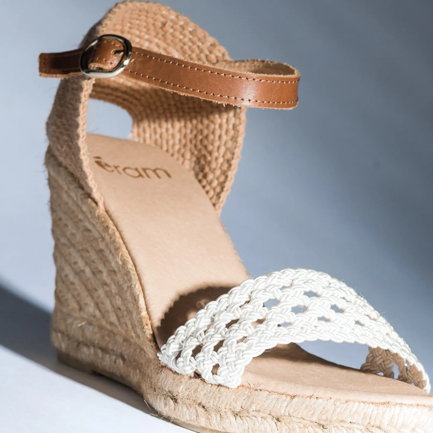 L’esprit croisière anime cette sandale compensée pour femme. Montée sur un talon en corde de 9 cm, avec patin avant de 2 cm, elle maintient le pied, à l’avant par une large bride écrue tressée, à l’arrière par une tige souple en coton biologique certifié GOTS marron, à la cheville par une bride synthétique camel. Un modèle à porter avec un tailleur-short ou bermuda, en lin, dans des teintes naturelles ou pastel.
