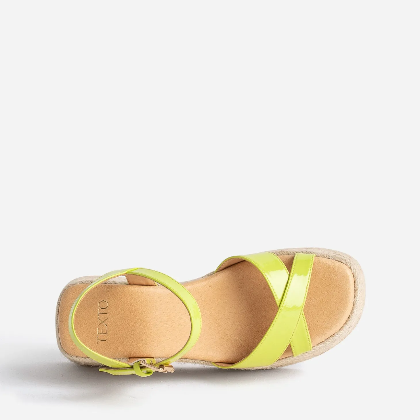 L’invention parfaite pour gagner des centimètres sans risques ? C’est la sandale compensée, avec plateforme. Ici, la semelle de 9 cm à l’arrière et de 4 cm à l’avant est entièrement recouverte de corde naturelle. Dessus, les brides en matière synthétique se déclinent en coloris lime, avec finition vernie. A vous les jolies robes dans les nuances de bleu, de vert ou de rose.