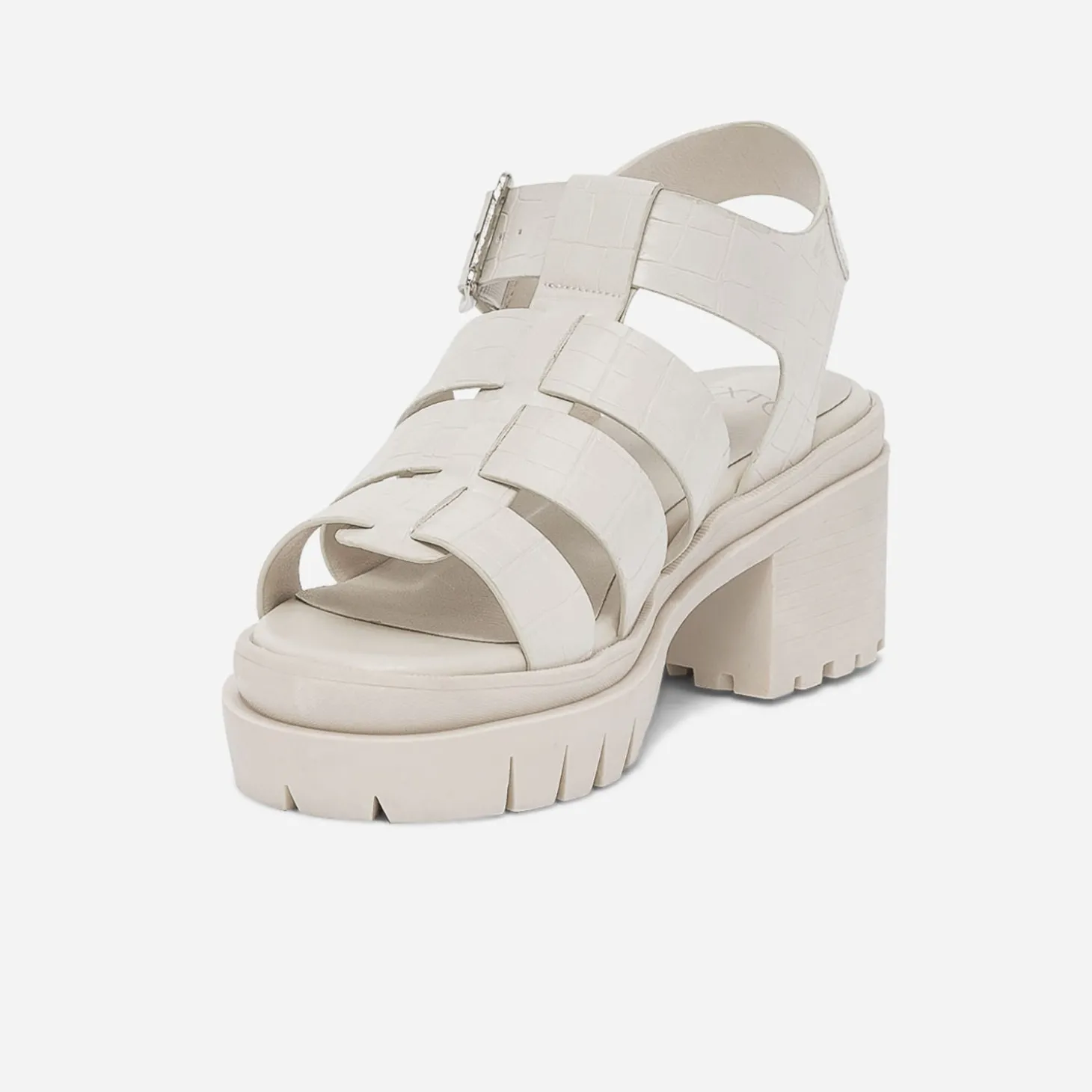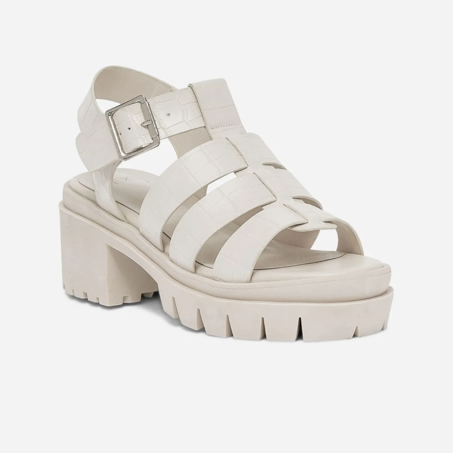 La sandale se réinvente. Les modèles plus imposants ont définitivement la cote cette saison. En matière synthétique écrue, la sandale femme se pare d’un embossage effet croco sur ses larges brides et se ferme par une boucle carrée en métal argenté. Montée sur une semelle épaisse et crantée, elle affirme un style décontracté inspiré du streetwear. Un modèle à jouer avec des vêtements fluides, comme un cropped top et un pantalon large.