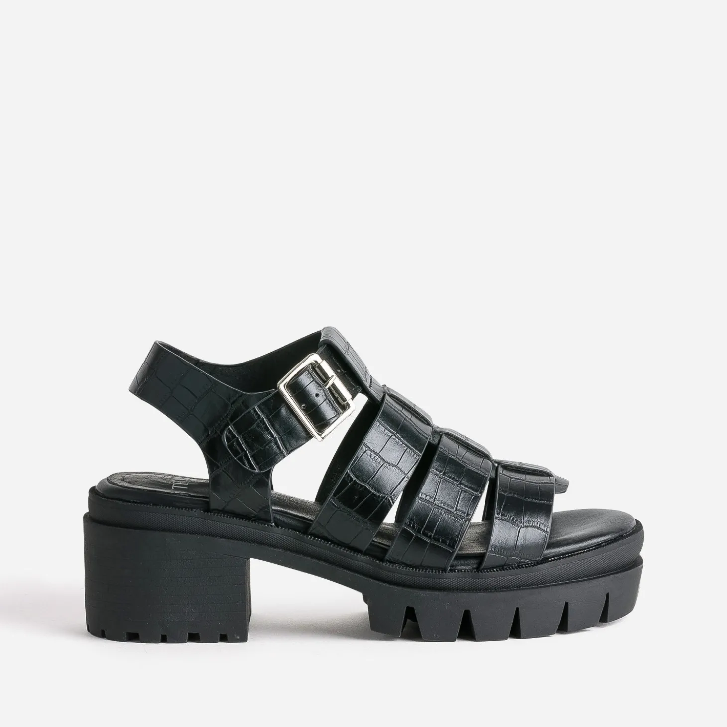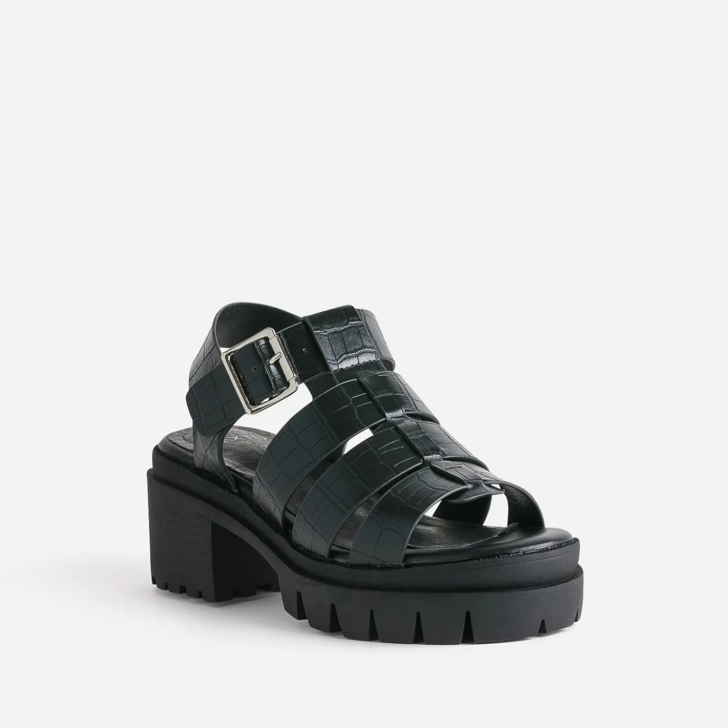 La sandale se réinvente. Les modèles plus imposants ont définitivement la cote cette saison. En matière synthétique noire, la sandale femme se pare d’un embossage effet croco sur ses larges brides et se ferme par une boucle carrée en métal argenté. Montée sur une semelle épaisse et crantée, elle affirme un style décontracté inspiré du streetwear. Un modèle à jouer avec des vêtements fluides, comme un cropped top et un pantalon large.