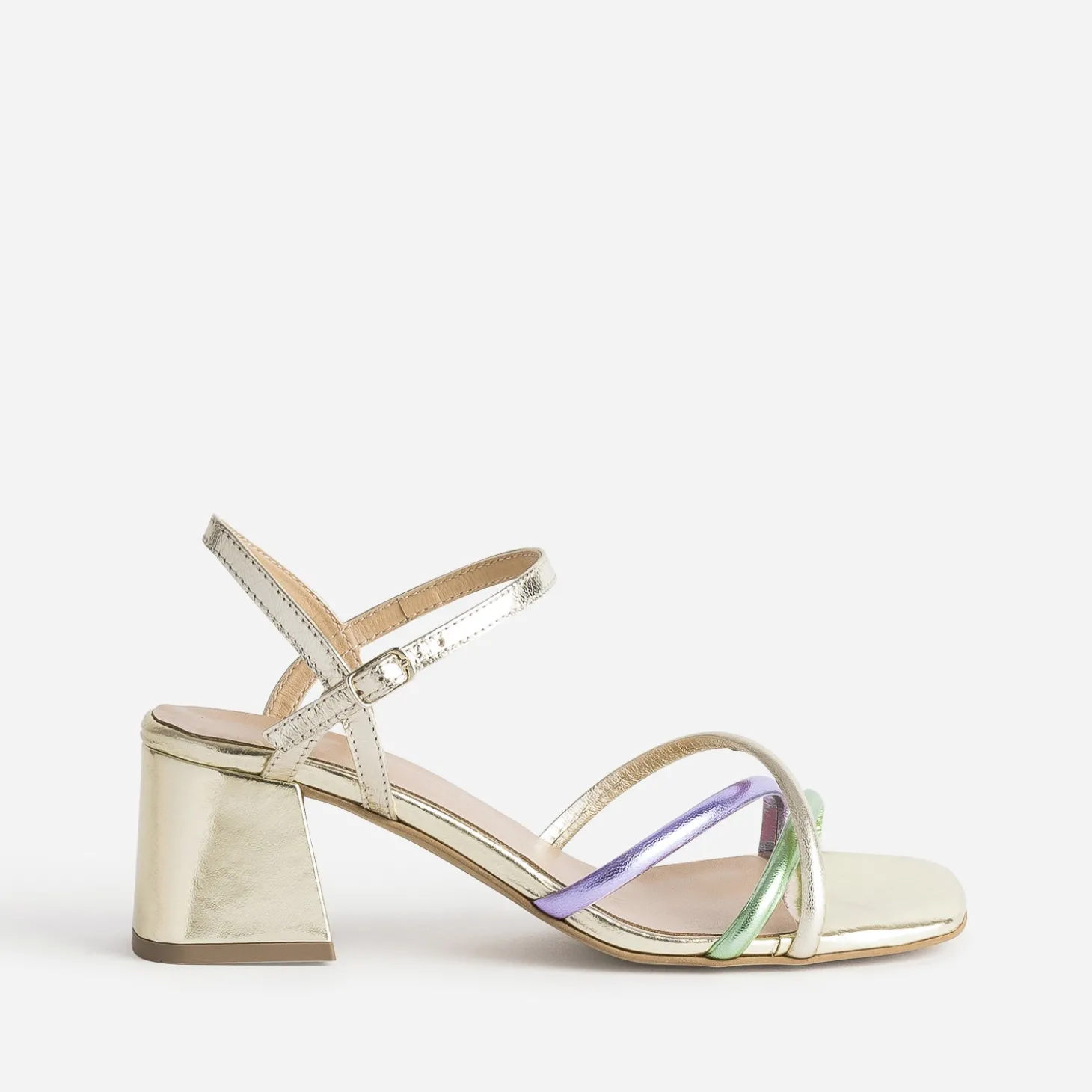 La tendance métallisée s’invite sur cette sandale d’été pour femme. En cuir doré, elle maintient le pied, par 3 brides matelassées, couleur or, parme ou vert clair. Elle est montée sur un talon flare de 6 cm, idéal pour danser lors d’une cérémonie festive comme pour marcher au quotidien. Avec, privilégiez une tenue pastel, dans les mêmes tons.