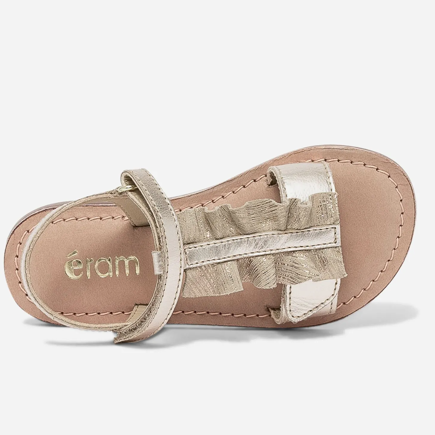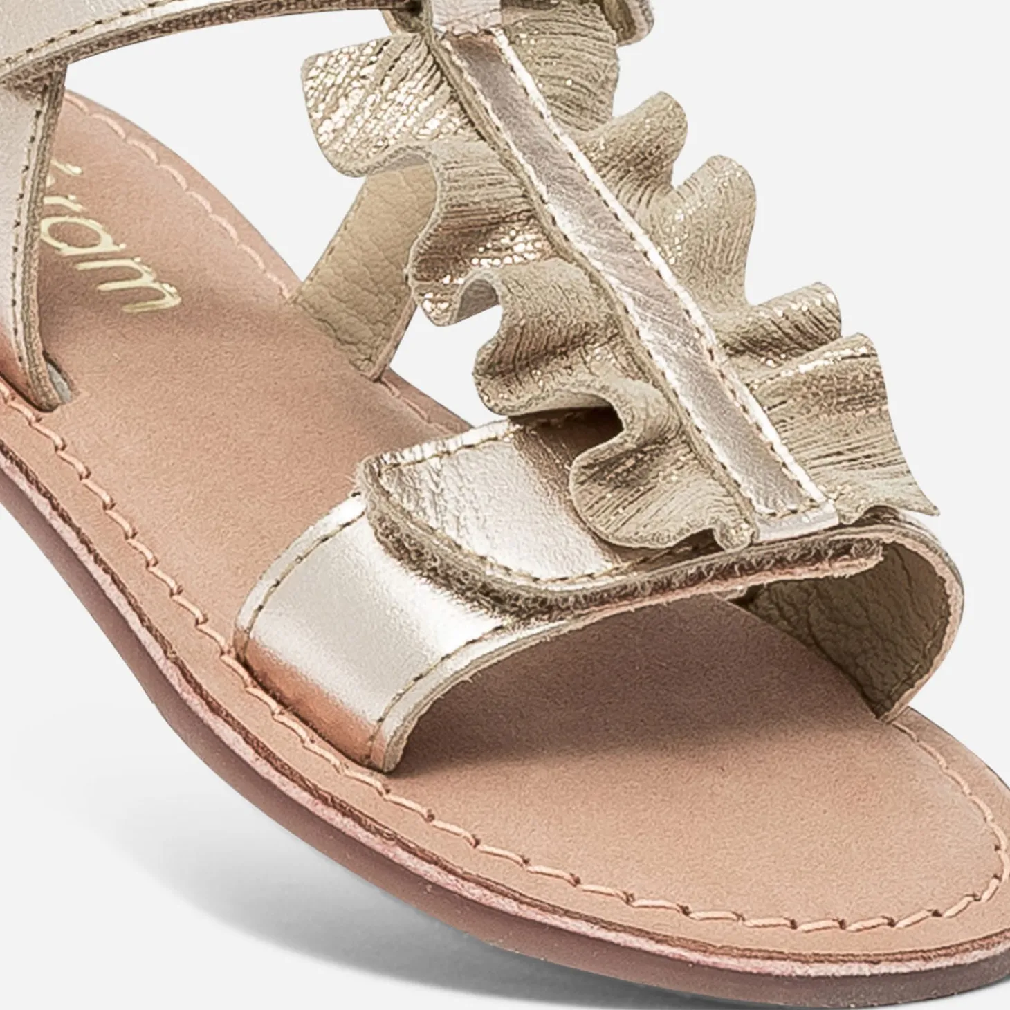 Des fermetures par scratchs pour faciliter l’autonomie des petites mains. Un cuir doré pour briller. Un détail de volant beige à stries métallisées sur la bride en T. 3 bonnes raisons de craquer pour cette adorable sandale pour petite fille.