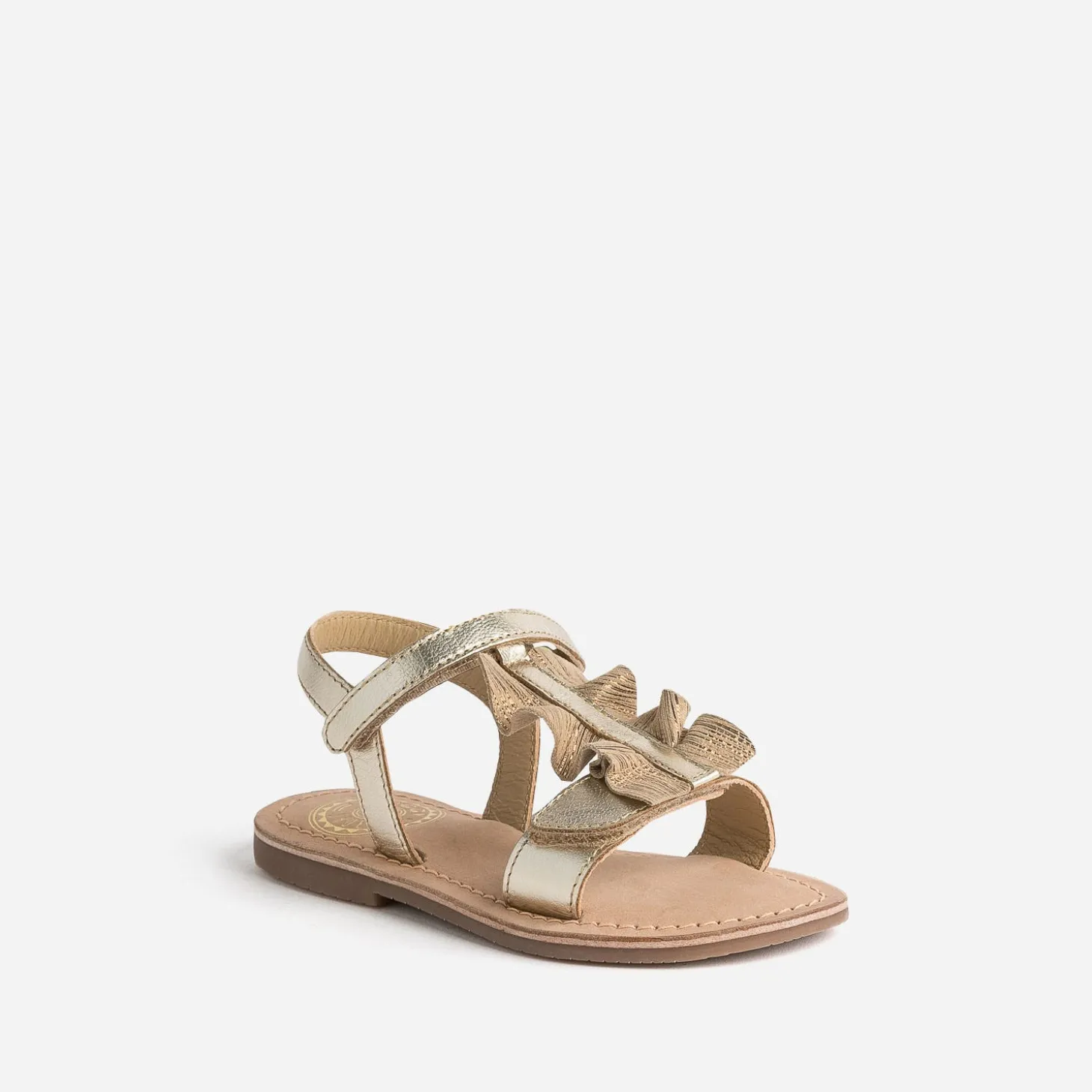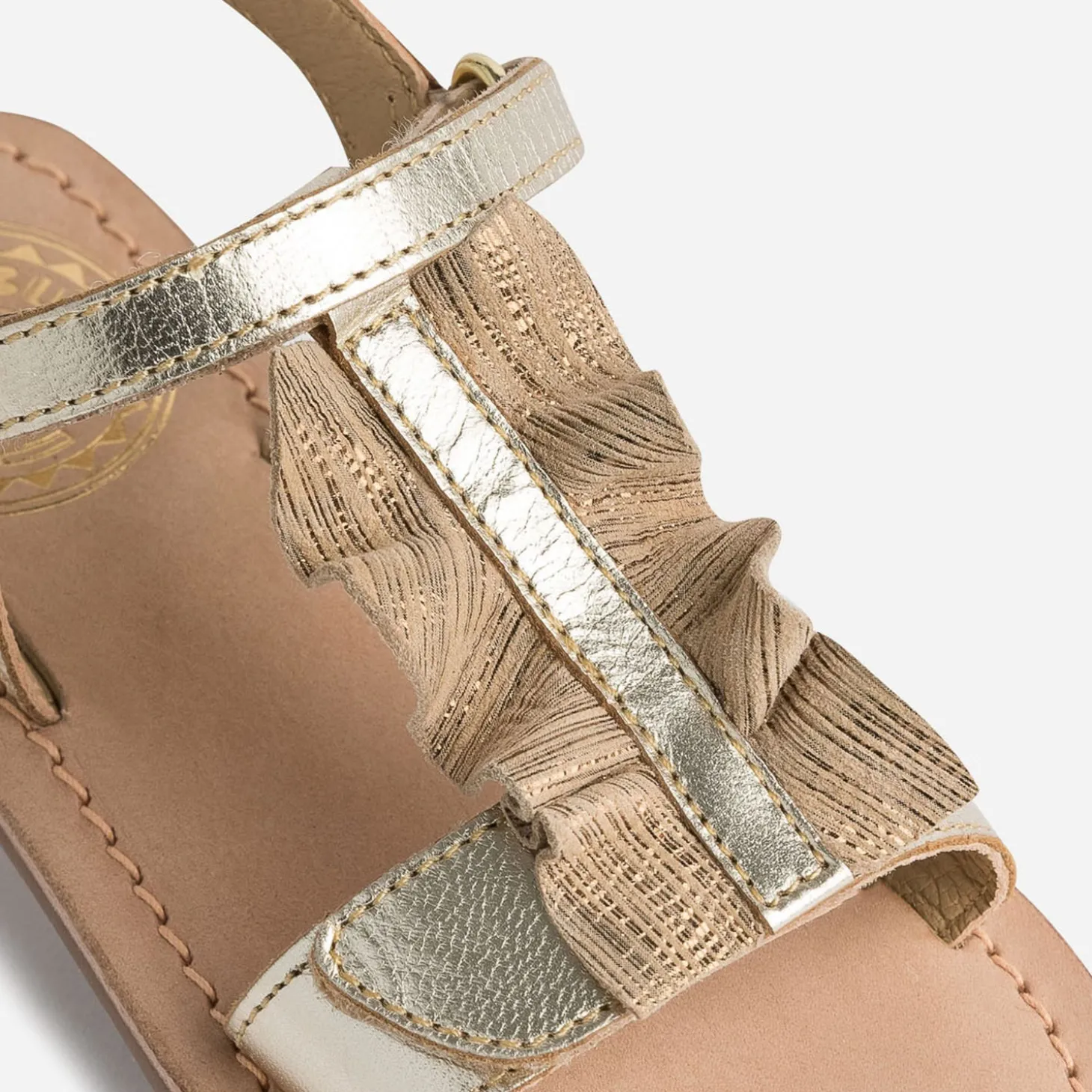 Tout en cuir, tout dorée, cette sandale fille ne va pas la quitter de tout l’été. Deux scratchs permettent d’ajuster le maintien du pied, renforcé par une bride en T, décorée d’un volant.