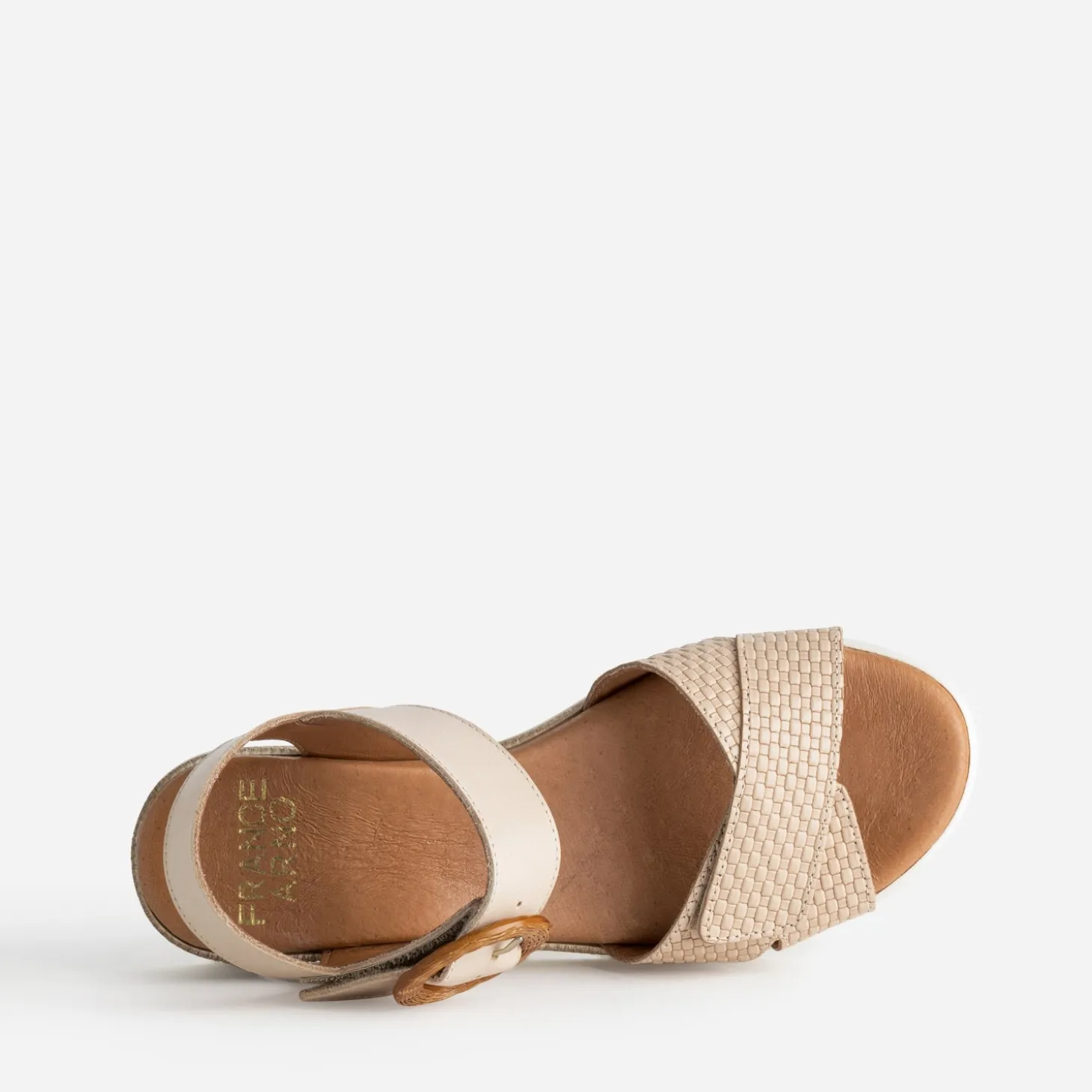 Les jeux de matières s’invitent sur cette sandale pour femme, en clin d’œil évident à l’artisanat : cuir embossé avec effet tressé, boucle façon rotin, semelle extérieure bi-matière légèrement compensée. Afin de ne pas négliger votre confort, elle est montée sur une semelle première moussée, avec bride ajustable par scratch. Un modèle en cuir beige, facile à accorder avec des nuances de marron.