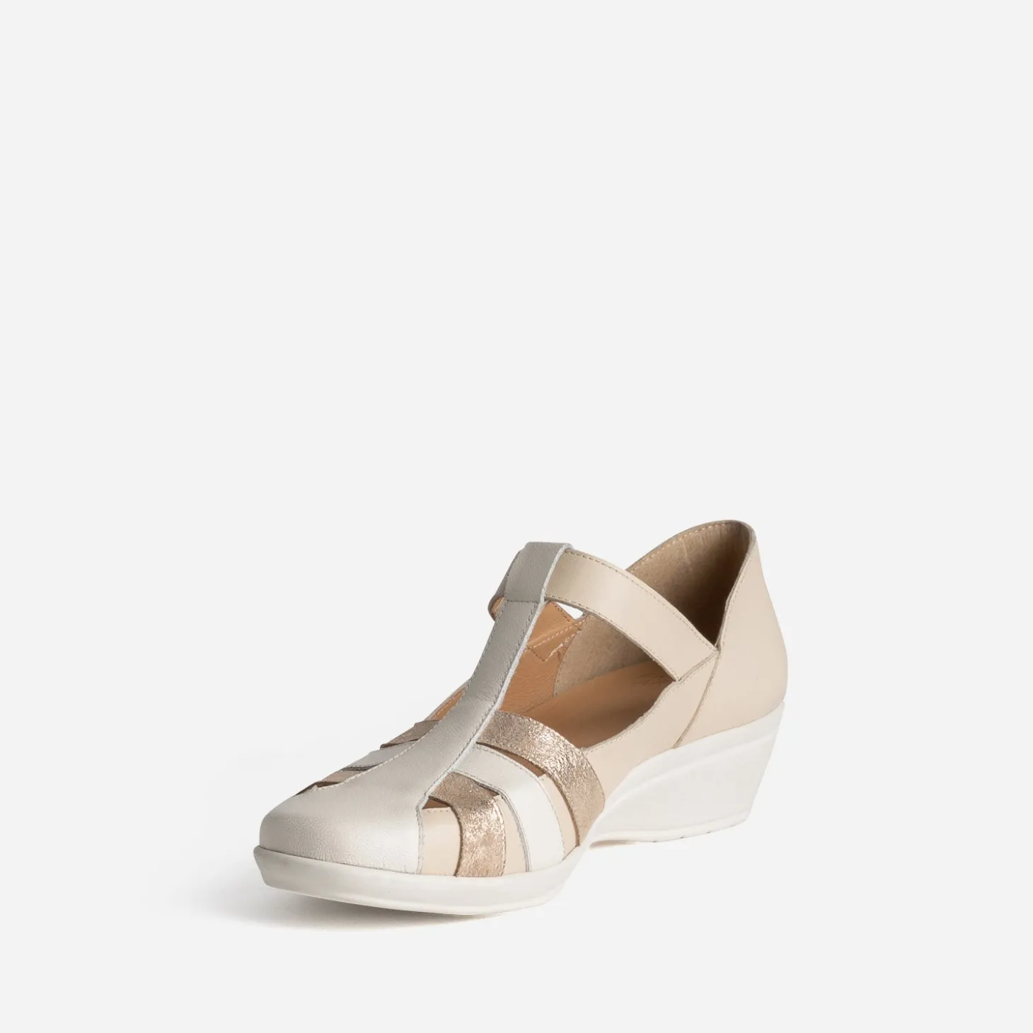 La sandale ne déroge pas à la règle. Confectionnée en cuir lisse beige, elle est rythmé de brides dont deux dorées et se ferme par scratch. La semelle extérieure est légèrement compensée, la semelle intérieure est amovible, pour pouvoir insérer une semelle adaptée. Un modèle idéal pour soulager au quotidien.
