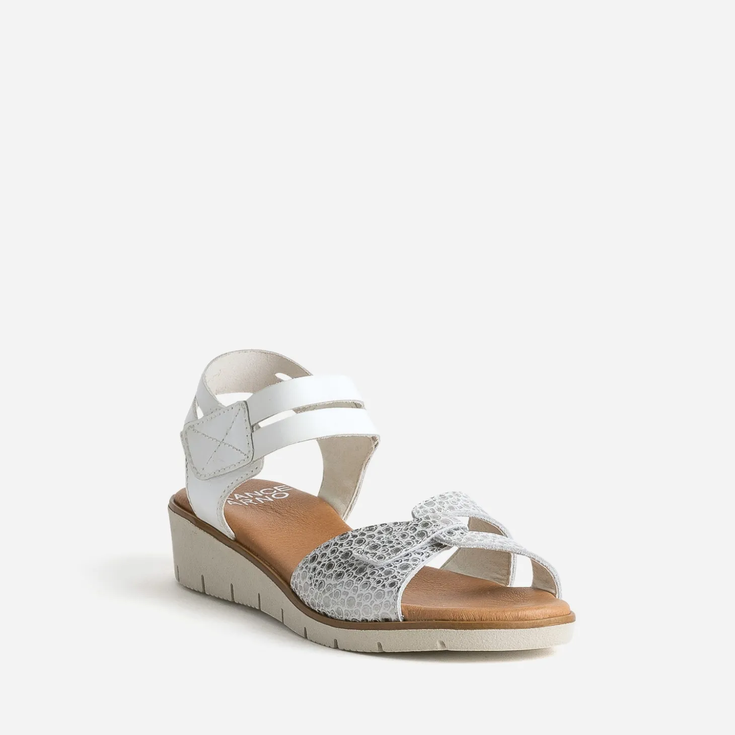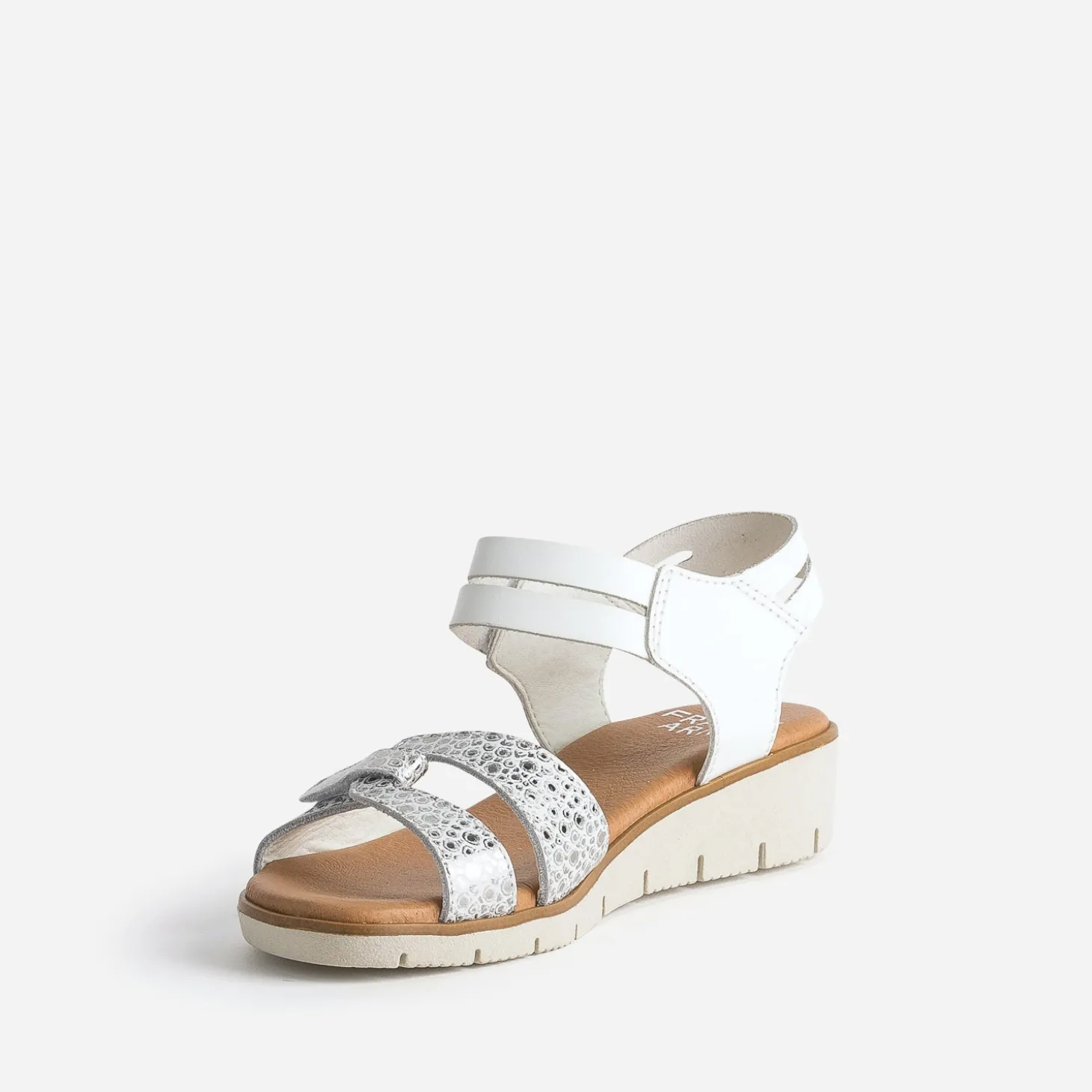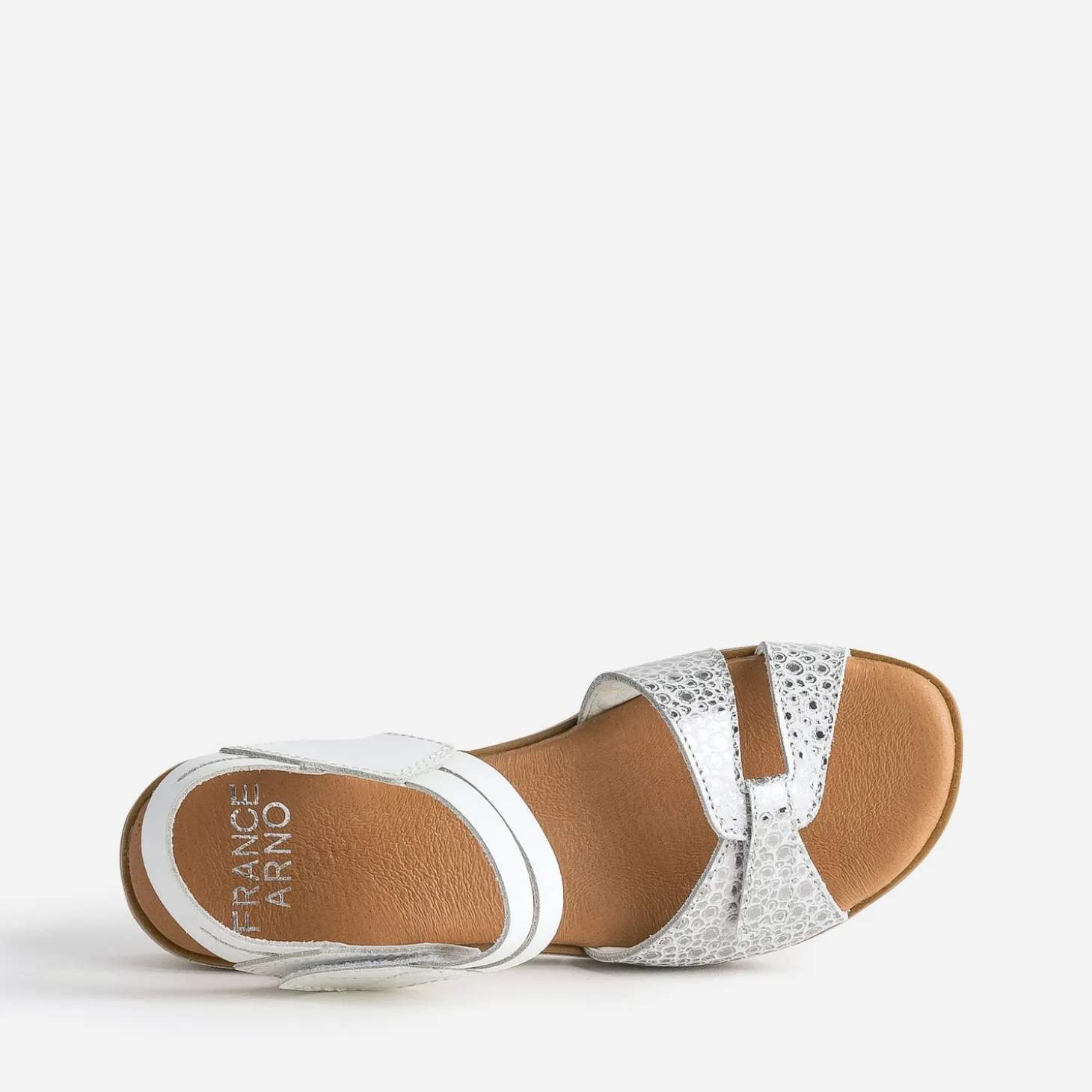 La sandale est indiscutablement LE modèle-phare de la saison estivale. Laissez-vous surprendre par le confort de ce modèle pour femme, qu’elle doit à sa semelle intérieure moussée, montée sur une semelle légèrement compensée. Confectionnée en cuir lisse, elle se décline en coloris blanc et se laisse twister par un motif fantaisie métallisé argenté sur la bride avant ; brides facilement ajustables, grâce au système de scratchs. Ses alliées ? Une tenue casual chic, dans les tons blanc, gris ou pastel.