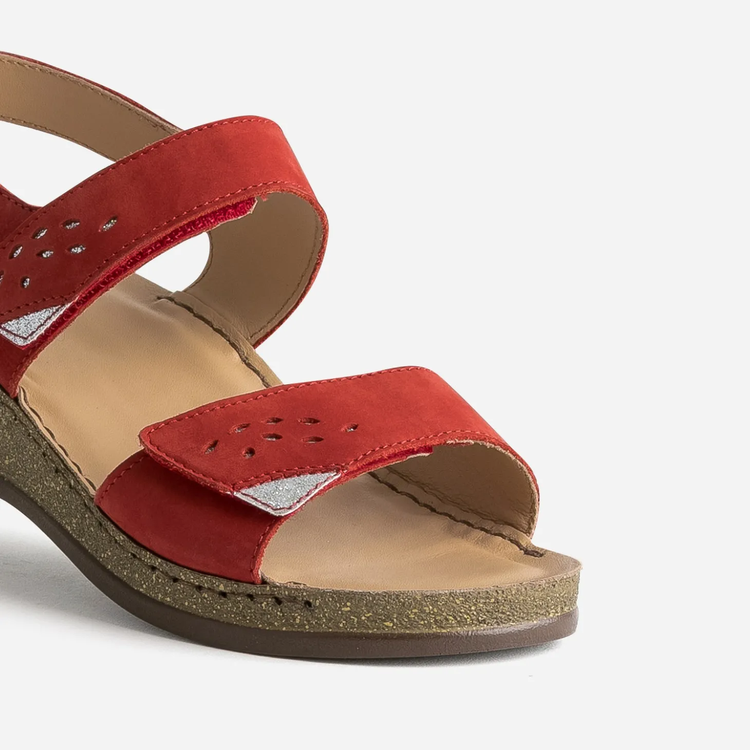 Petit talon compensé, semelle intérieure moussée, fermeture par scratchs ajustables, cette sandale pour femme va faire le bonheur de votre été ! Confectionnée en cuir nubuck, elle se décline en coloris rouge, avec des petits détails pailletés argentés. Idéale avec du beige ou du camel, elle s’ose aussi avec du rose fuchsia, du gris ou du motif léopard.