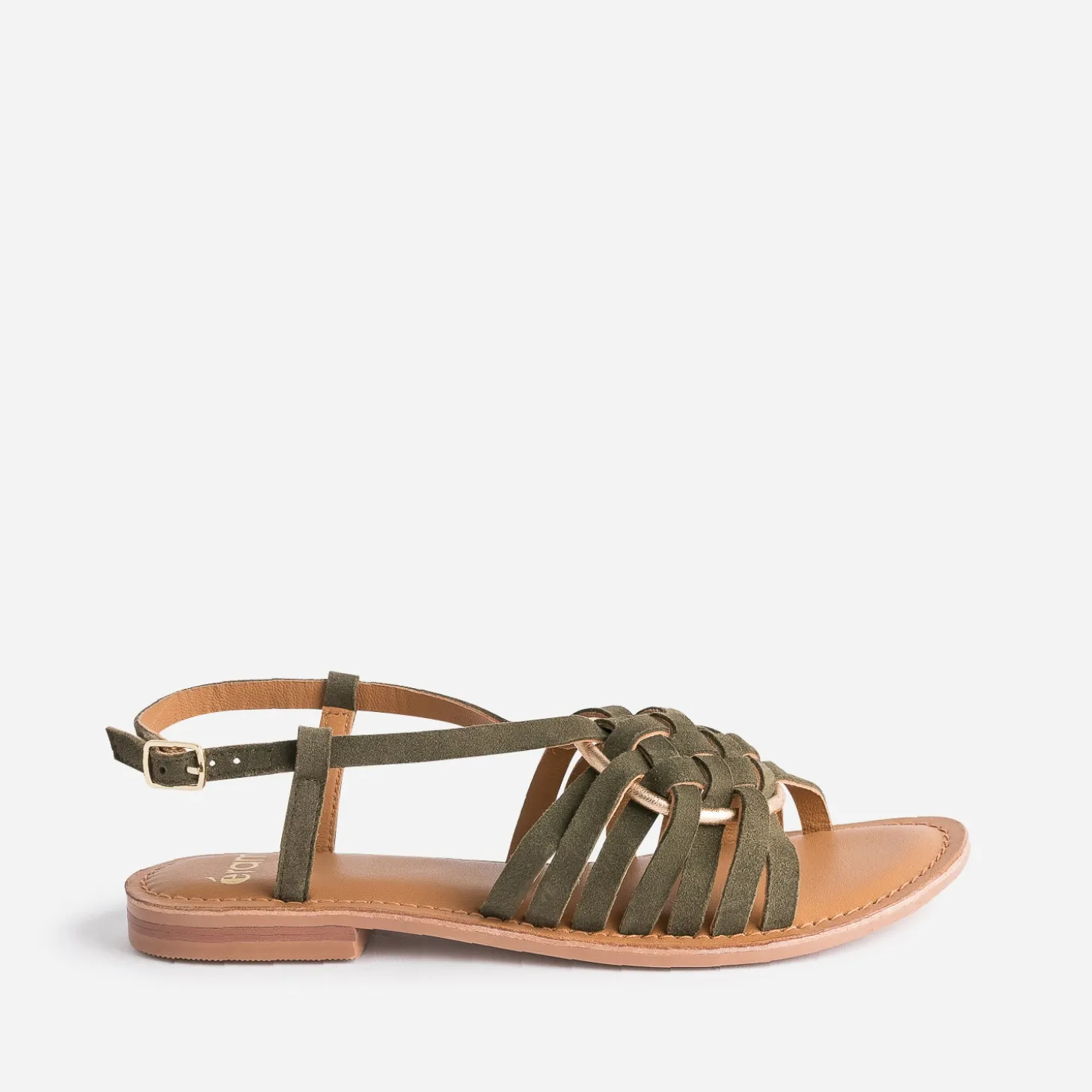 La sandale plate fait un retour remarqué cette saison. En cuir velours, elle séduit par son coloris kaki foncé, sur un jeu de brides tressées, associées à un anneau en cuir doré, le tout placé sur le dessus du pied. Un savoir-faire artisanal à mettre en valeur avec un look ethnique ou bohème, dans les tons naturels.