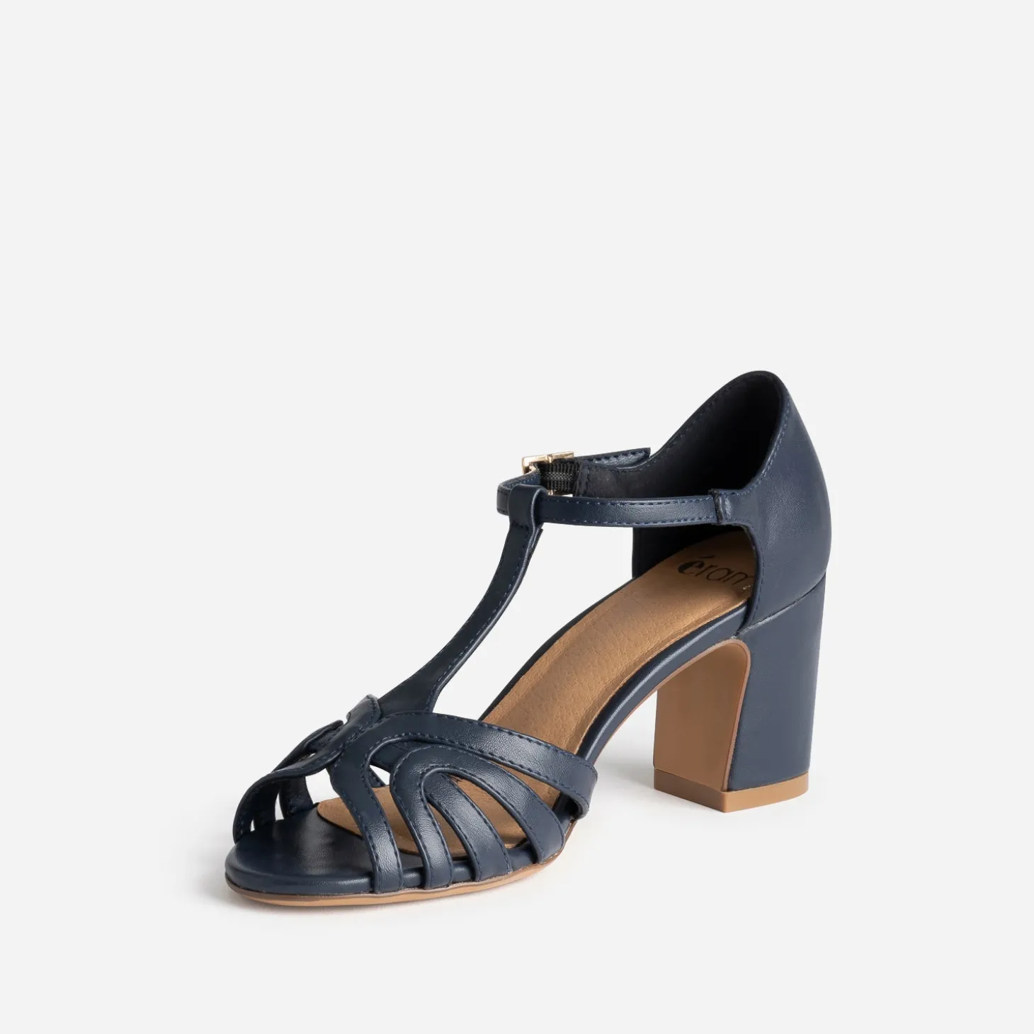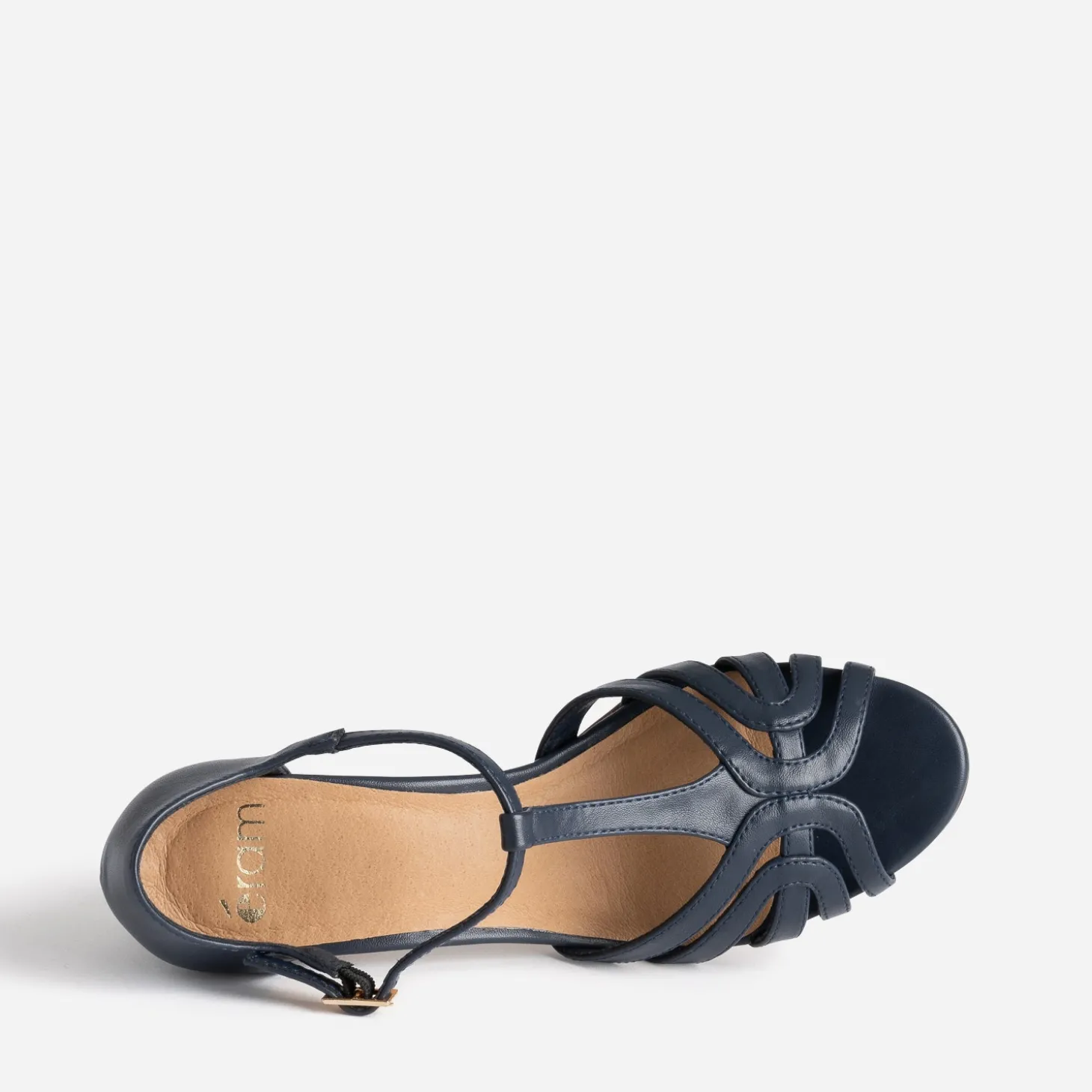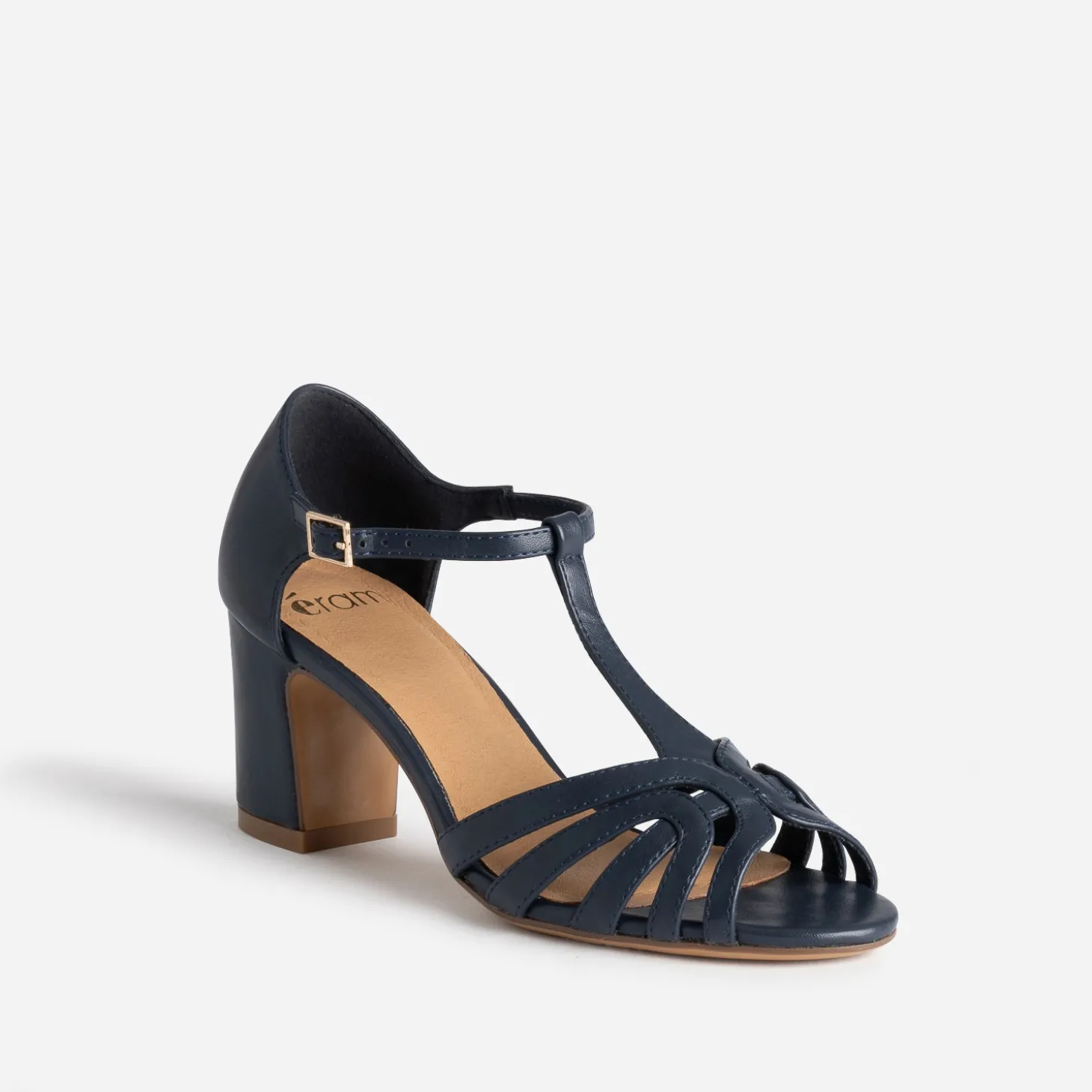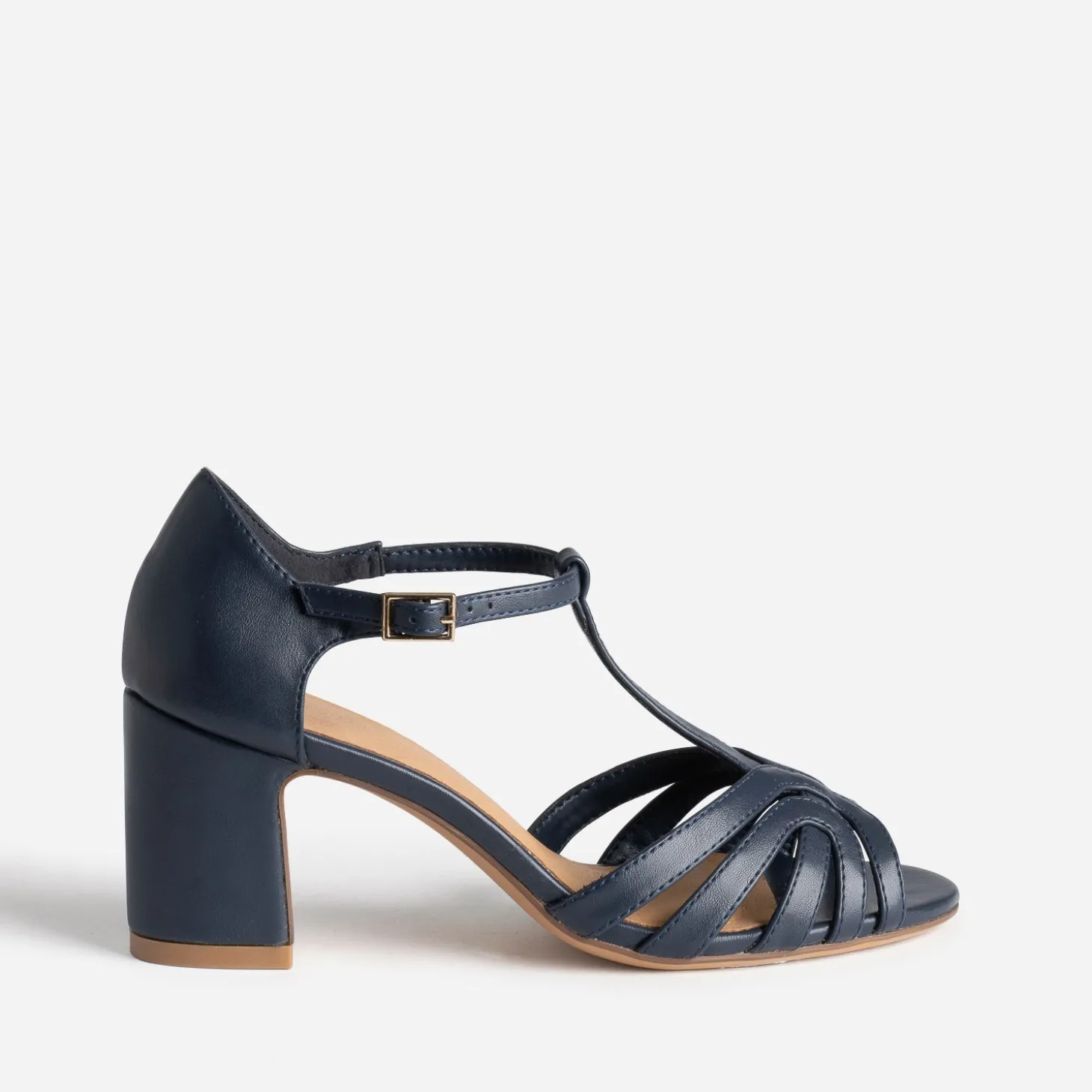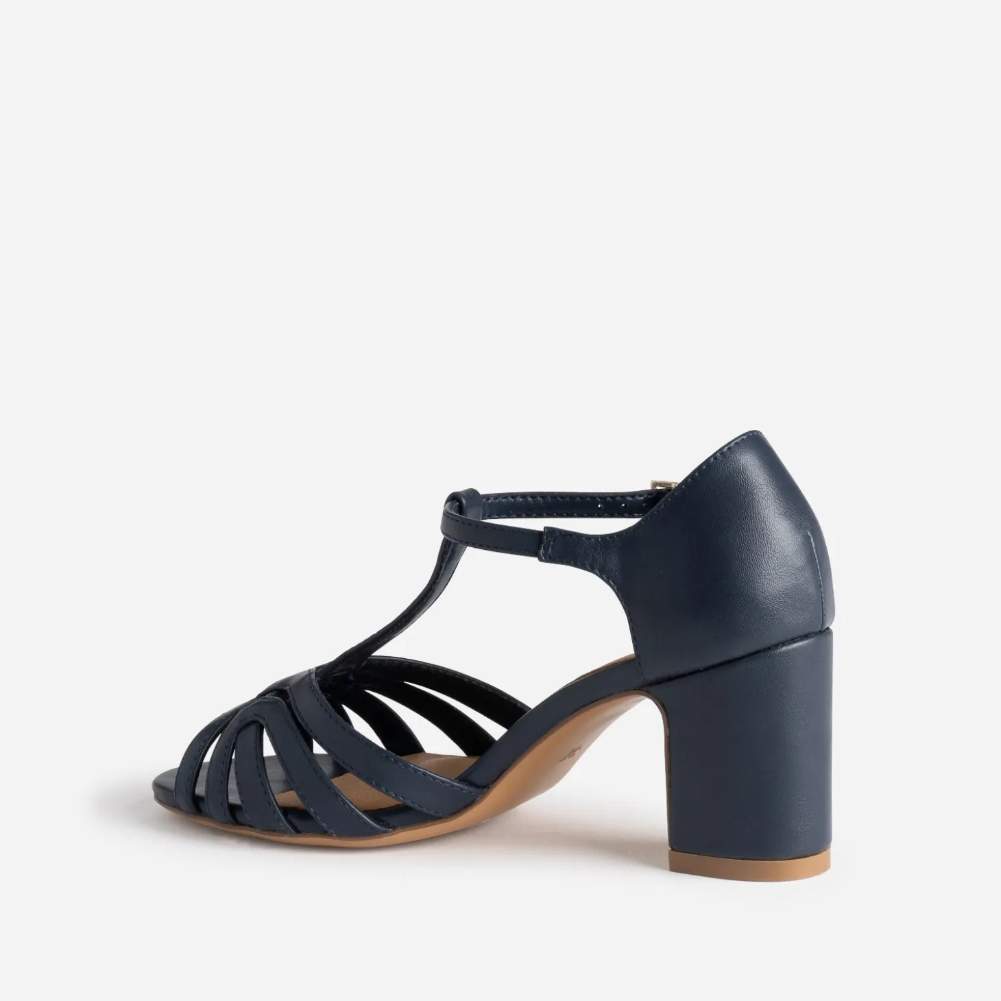 Inspirée par l’univers de la salsa, la sandale femme lui emprunte de multiples brides, retenues par un contrefort arrière. Elle se modernise par un talon carré de 7 cm et une matière synthétique lisse de couleur bleu marine. Profitez-en pour sortir vos pièces les plus aériennes et vaporeuses, comme une robe à bretelles de couleur cognac ou orangée, avec une ceinture pailletée.