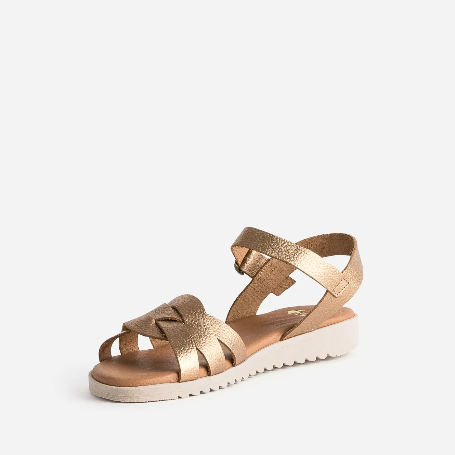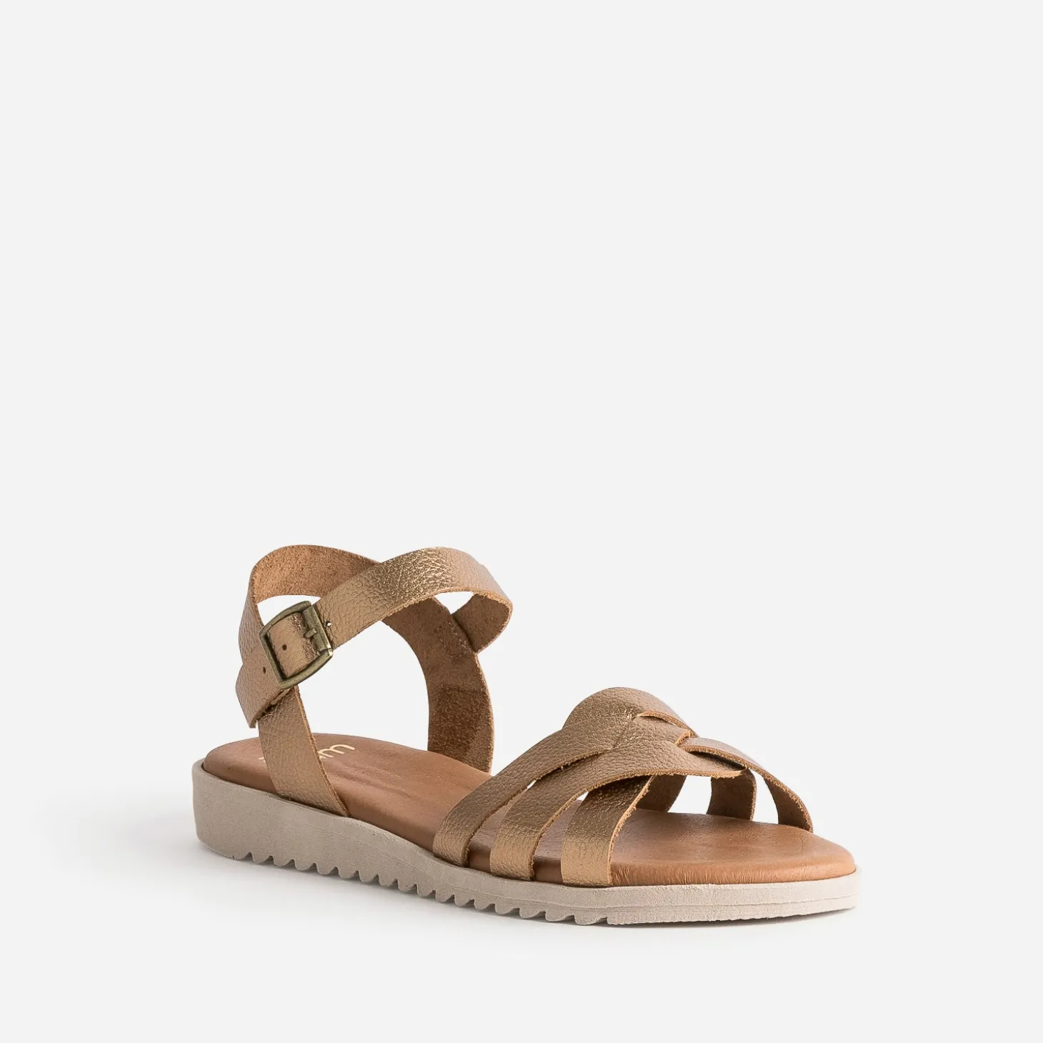 L’idée d’une sandale, qui s’accorde avec tout, est une perspective réjouissante. En cuir marron, avec finition métallisée, celle-ci marque sa singularité par des brides croisées sur le dessus du pied et montées sur une semelle crantée, légèrement compensée. Un modèle idéal, dès l’arrivée des beaux jours, avec des looks plutôt casual.
