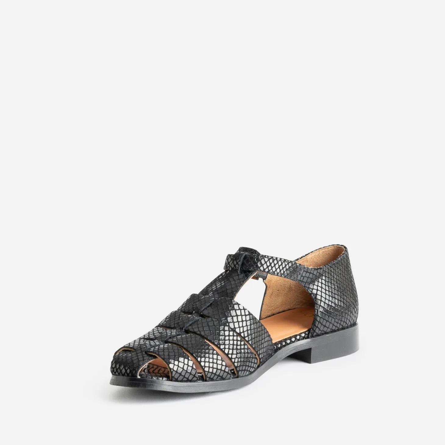 Inspiré par les chaussures des pêcheurs, la sandale fisherman s’impose comme l’une des grandes tendances de la saison. En cuir velours noir, elle ose un effet résille ton sur ton sur les brides et la tige rigide placée à l’arrière. Ni trop ouverte, ni trop fermée, elle est idéale pour l’entre-saison, avec un look masculin-féminin.