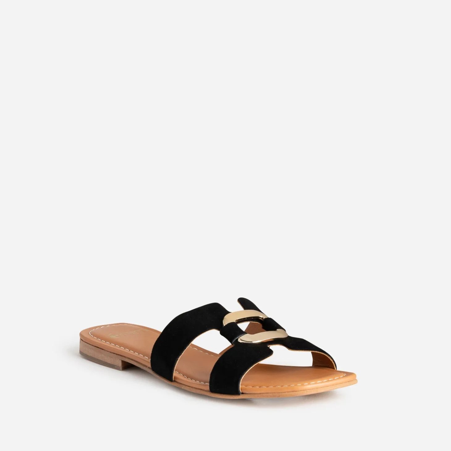 La mule a quitté les plages pour s’inviter en ville, finalisant des looks de style casual chic. La large bride, confectionnée en cuir velours noir, est rythmée de découpes graphiques et décorée d’un anneau en métal doré. Plate, elle s’accorde aussi bien avec un top noir à encolure carrée et un jean cropped blanc, qu’avec une robe longue imprimée.