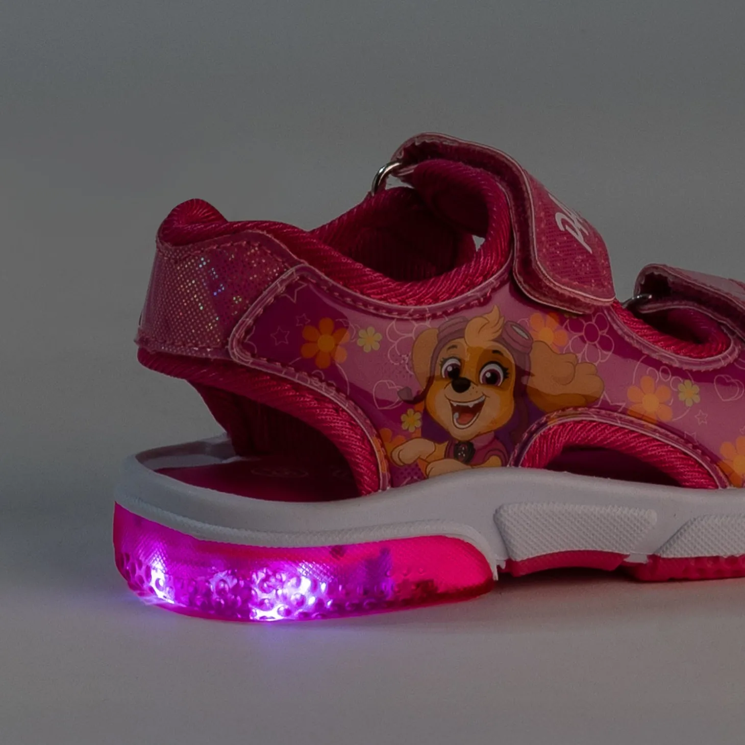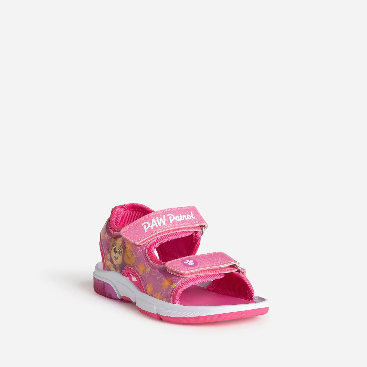 Offrez à votre fille la joie d’avoir Stella toujours à ses côtés, avec cette sandale spécialement conçue pour les fans de la petite cocker. Entièrement rose, elle associe motif fleuri sur finition vernie, sans oublier la touche de paillettes. Pensée pour être confortable et pratique, elle se ferme par deux scratchs avec logo et patte de chien. Son petit plus ? Une semelle qui clignote, à chaque pas. Un modèle qu’elle aura plaisir à porter, tout au long de l’été.