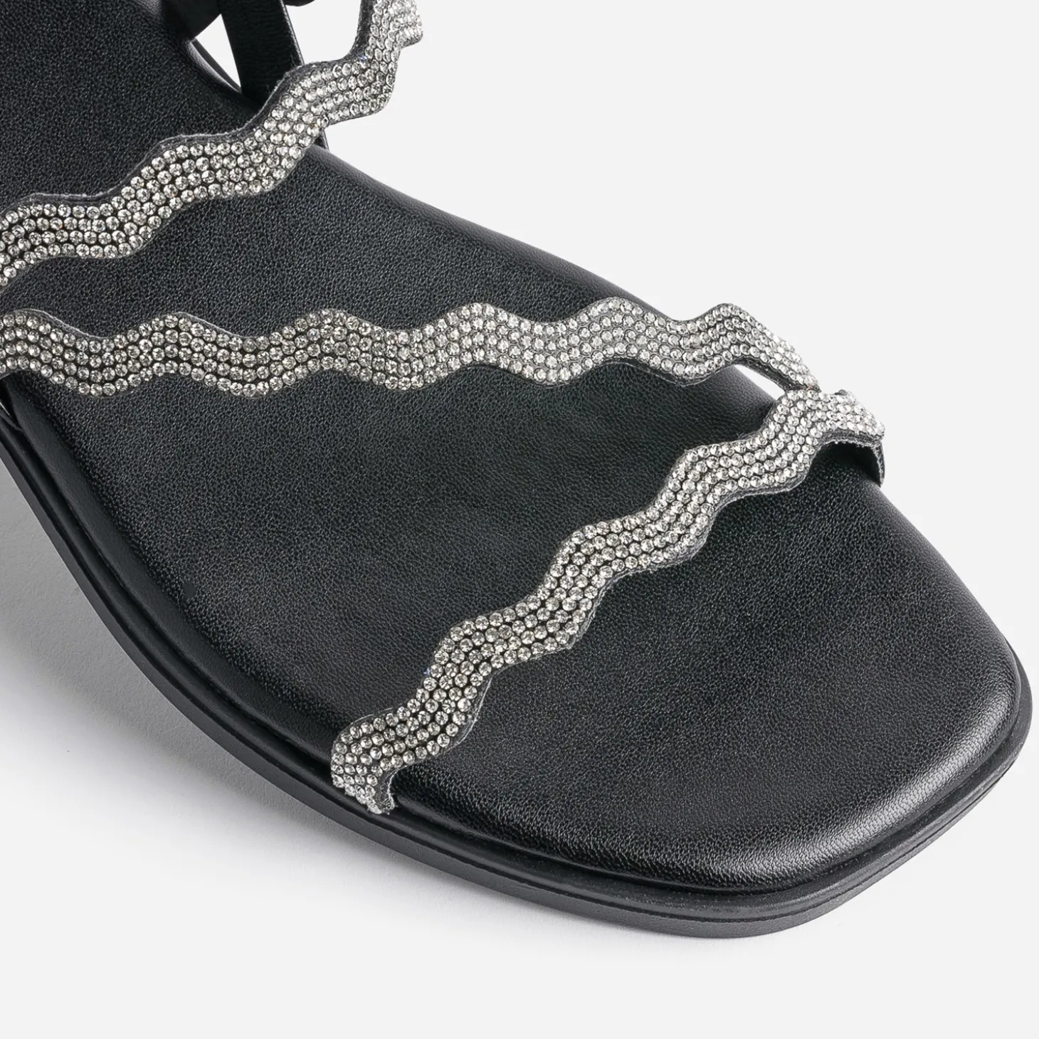 Il suffit parfois d’un détail. Ici, ce sont les strass blanc qui mènent la danse sur cette sandale pour femme. En matière synthétique noire, elle est modernisée par un bout carré et des brides façon vagues. Un modèle idéale pour apporter une touche de chic, à votre tenue : top blanc et jupe longue plissée noire, par exemple.