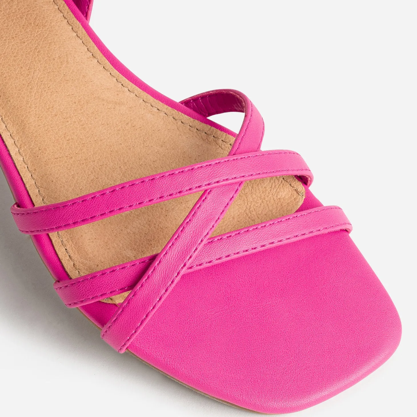 La sandale plate s’offre une nouvelle jeunesse, grâce à un coloris rose fuchsia et une finition mate. Sur le pied, autour de la cheville, les brides se croisent pour un maintien optimal. Avec un look army chic, dans les tons blanc et camel, avec un débardeur, un short en jean et un kimono long, laissez libre cours à vos envies.