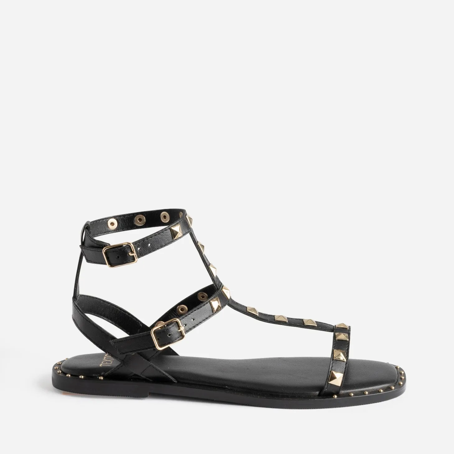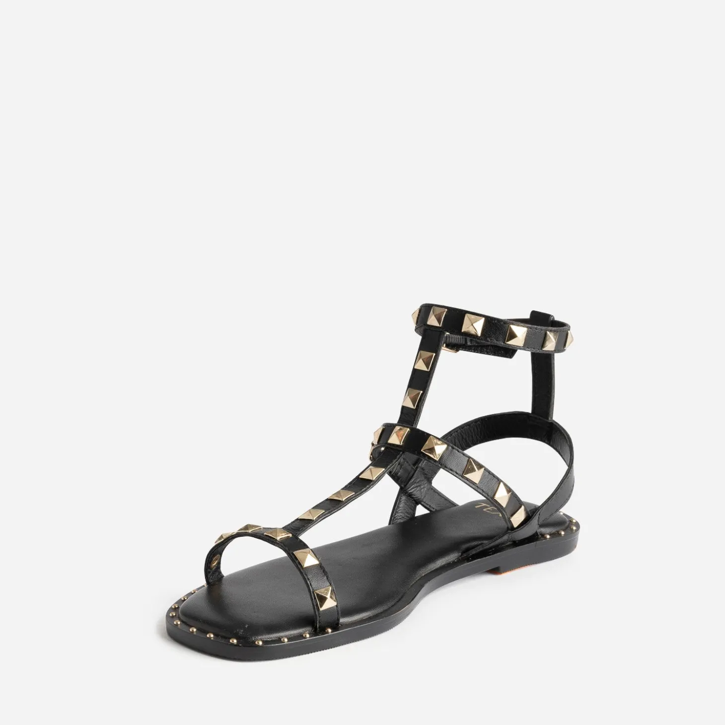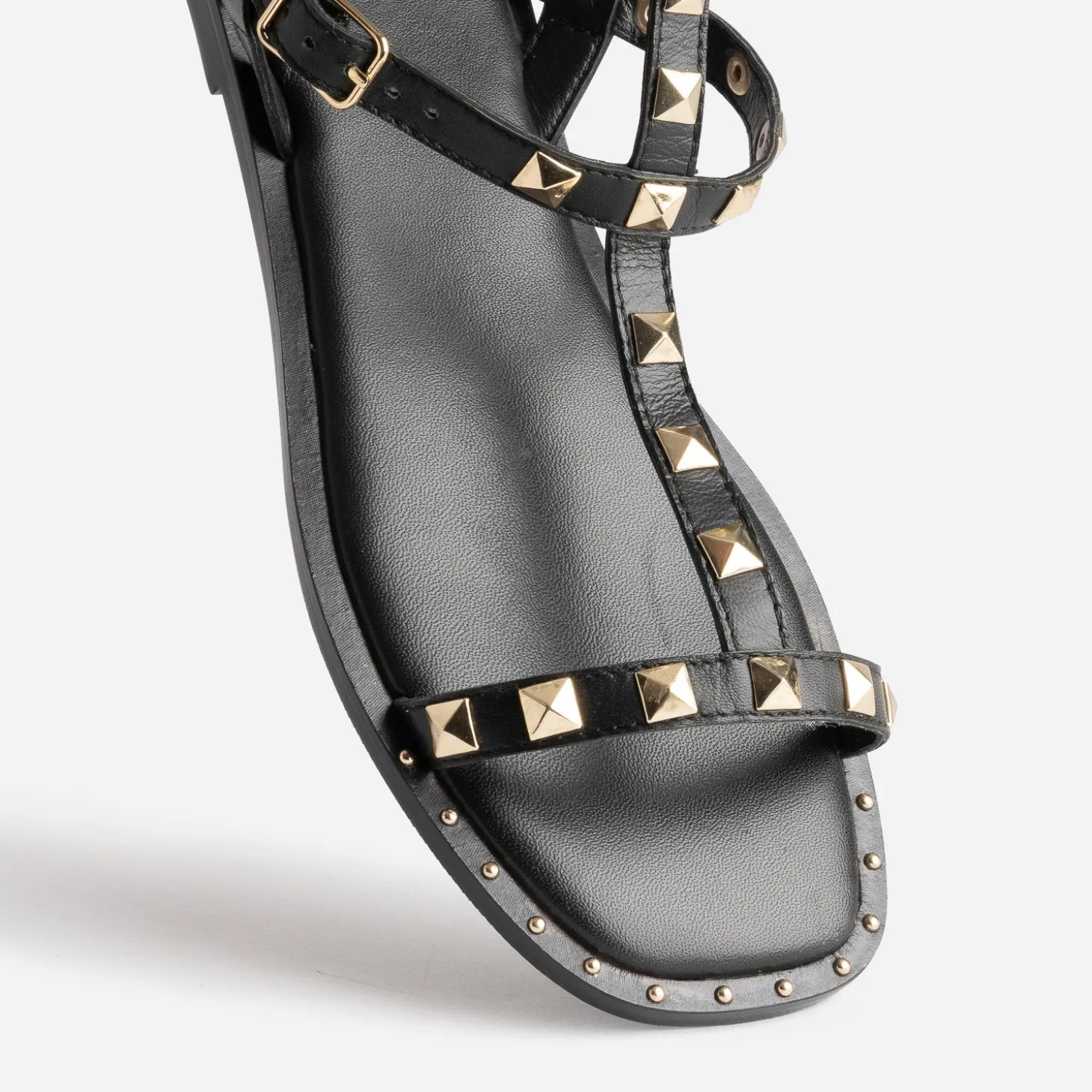 Revisitée par une tige montante, composée de 3 brides, cette sandale femme s’approprie le style spartiate. En cuir lisse noir, elle est décorée de clous de forme carrée facettée, en métal doré. La trépointe est rehaussée de micro clous, à l’avant et à l’arrière du pied. Associez son esprit rock n’ chic avec une robe longue noire plissée.