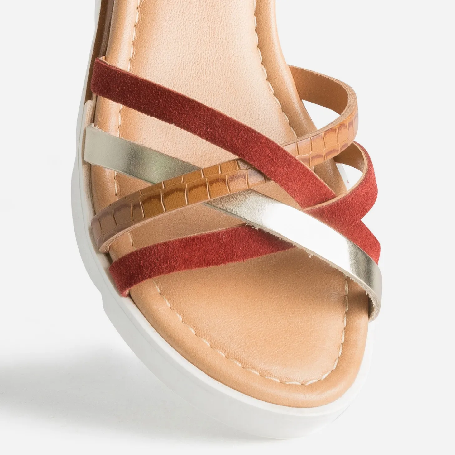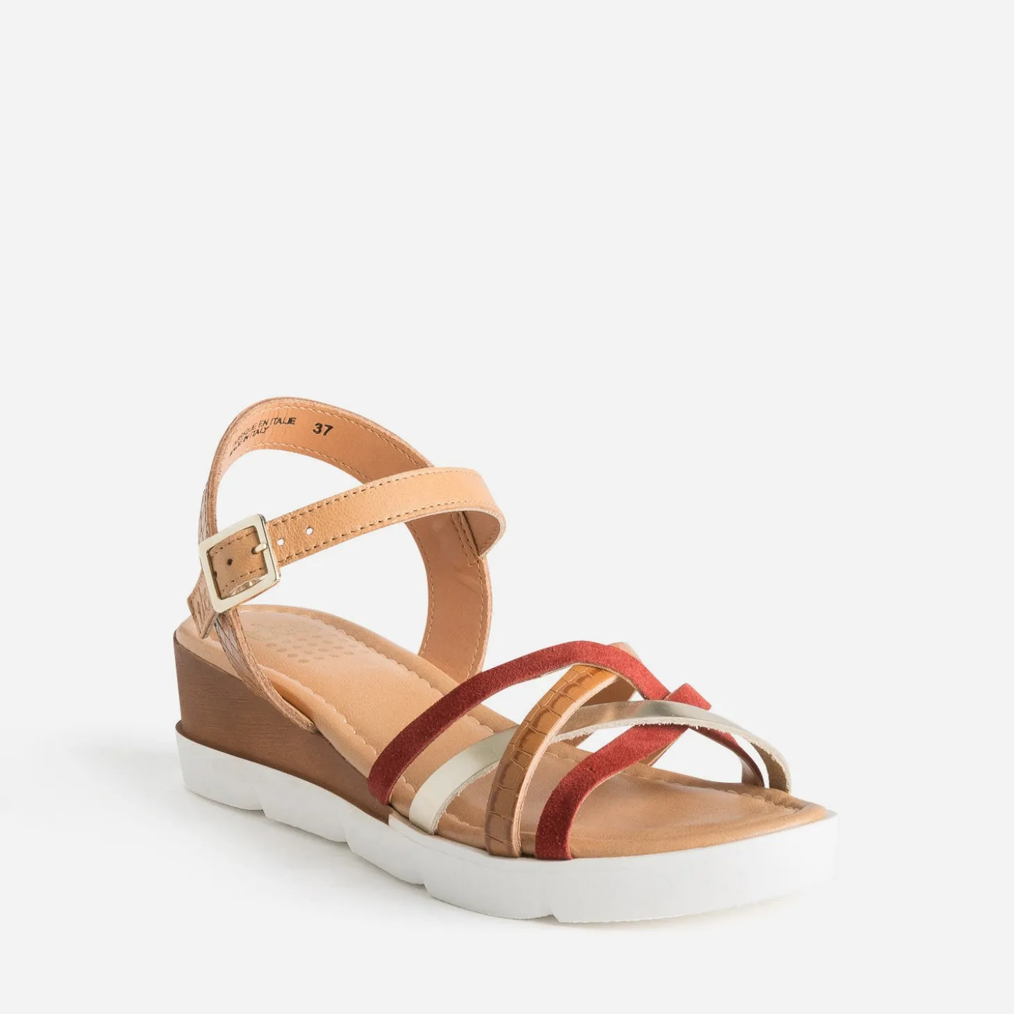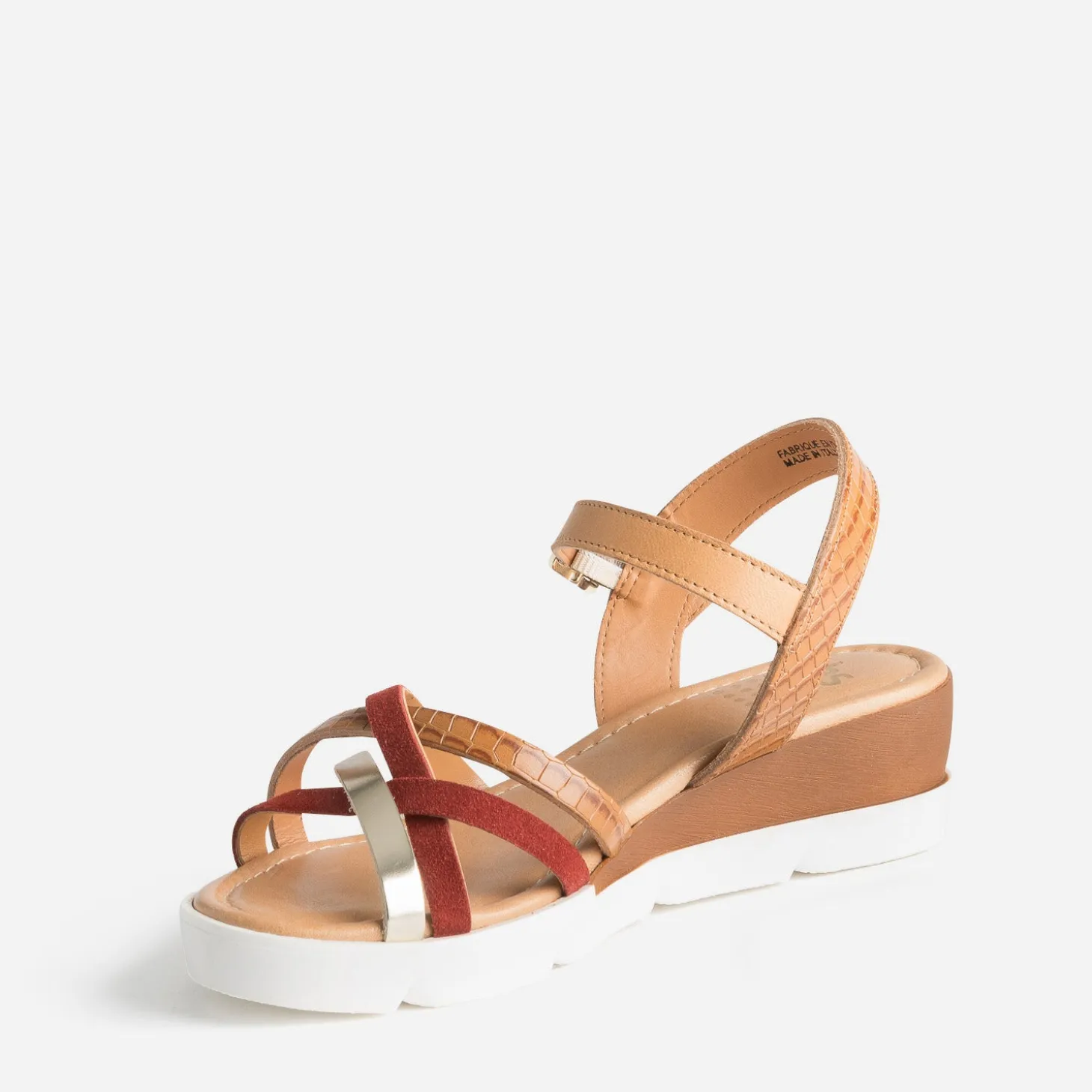 Née du sport, la marque TBS trouve son ancrage dans l’univers nautique. Légitime à terre comme en mer, ses produits sont reconnus pour leur confort. Affirmez votre style avec une sandale à l’aise en toutes circonstances. En cuir cognac, elle multiplie les brides pour maintenir le dessus du pied : cuir velours rouille, cuir lisse doré, cuir embossé effet python cognac. Montée sur une première moussée et un talon compensé, elle s’adapte à toutes vos activités de la journée.