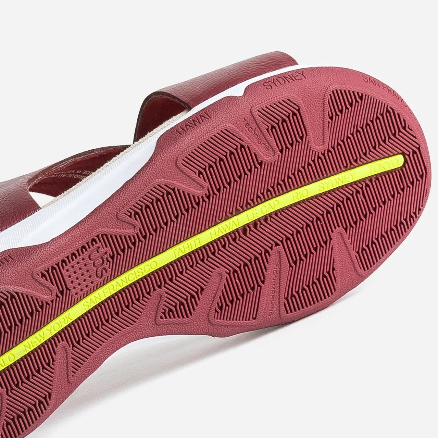 Née du sport, la marque TBS trouve son ancrage dans l’univers nautique. Légitime à terre comme en mer, ses produits sont reconnus pour leur confort. Dans la famille ‘Les Marinières’, demandez la sandale femme. Conçue en cuir lisse, montée sur une semelle première en cuir velours, elle maintient le pied par deux larges brides, fermées à l’arrière par un scratch. Coloris rouge foncé, elle finalise les looks les plus décontractés de l’été. New York, Hawaï, Saint Malo ou Hong Kong s’inscrivent sur le côté de la semelle, comme autant de destination qui font rêver !