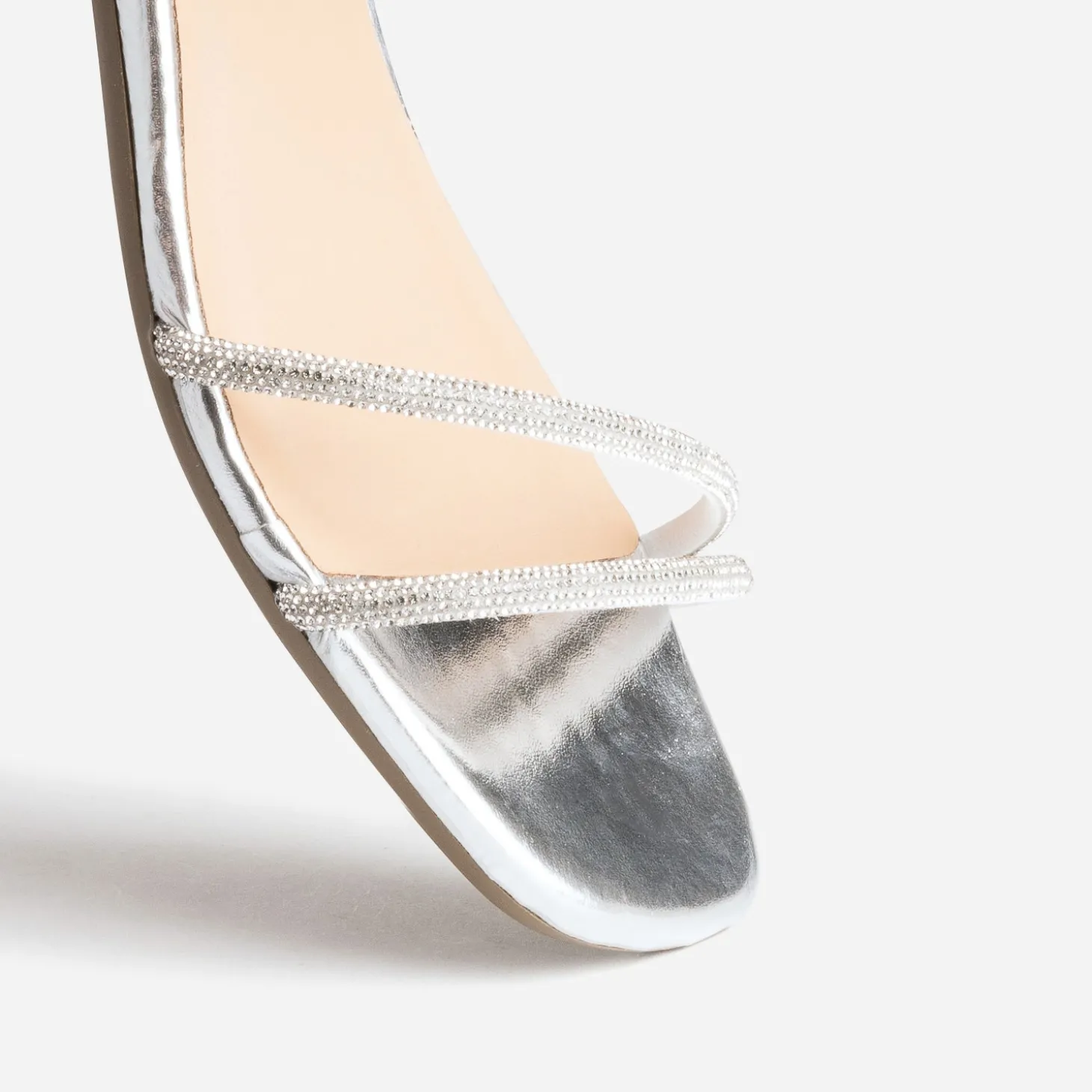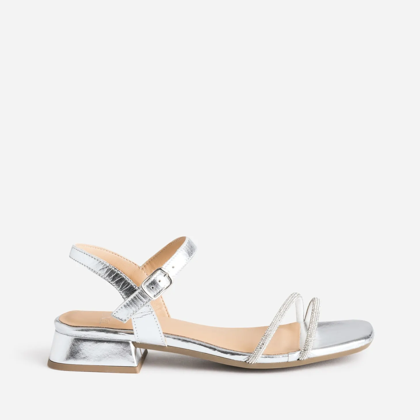 De la brillance, en toutes circonstances, et la tenue se fait chic, chic, chic ! Prenez cette sandale argentée. Elle est montée sur un petit talon, et séduit par sa double bride croisée sur le dessus du pied et recouverte de strass. Réservez-la avec une tenue dans les tons froids, bleu marine ou bleu ciel, vert anis ou vert foncé, prune ou parme.