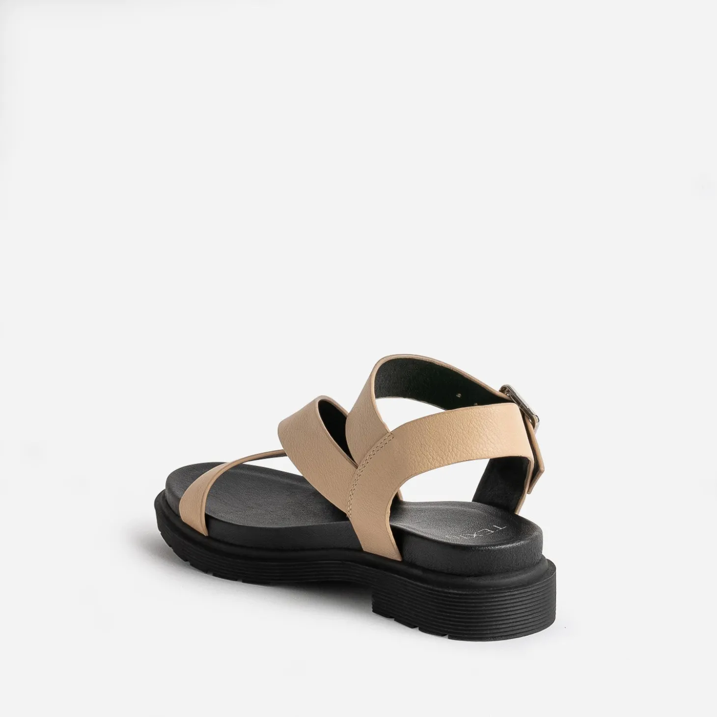 La première singularité de cette sandale femme, ce sont ces brides asymétriques. La deuxième, sa couleur beige, intemporelle. La troisième, sa semelle noire et légèrement crantée. Essayez ce modèle avec un tee-shirt blanc et un pantalon noir, large et plissé.