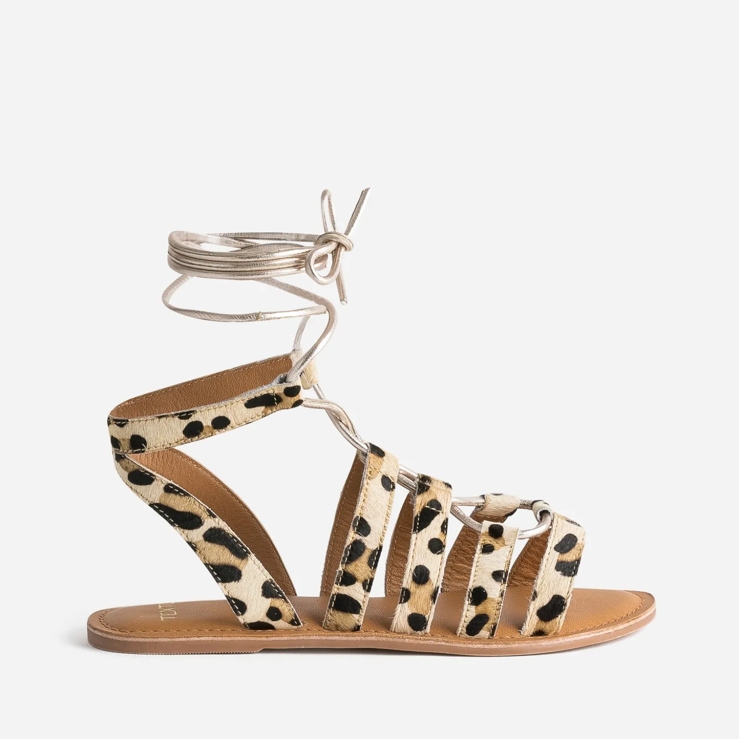L’été appelle le pied à se dévoiler… Cette sandale femme opte pour le plat et un jeu de multiples brides prolongées par 2 liens à nouer, autour de la cheville. En cuir beige façon poulain, à motif léopard, elle apporte, à la blouse blanche brodée, à la robe taille empire, une touche bohème, pile dans l’air du temps.