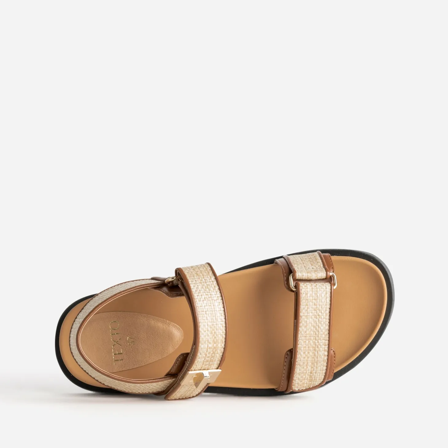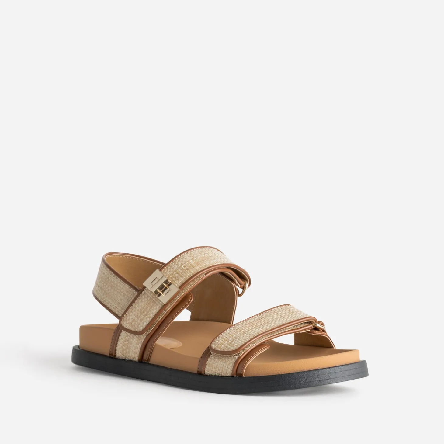 Ne lésinez pas sur le confort, même, et surtout, en été. Cette sandale, d’inspiration Dad Sandals, l’a bien compris : elle offre un maintien parfait, grâce à trois larges brides, dont deux fermées par scratch, s’ajustant au mieux sur le pied. Un tourniquet décoratif en métal doré est placé sur le côté. Choisissez-la en coloris beige sur effet raphia, parfait pour finaliser des looks ultra minimalistes.