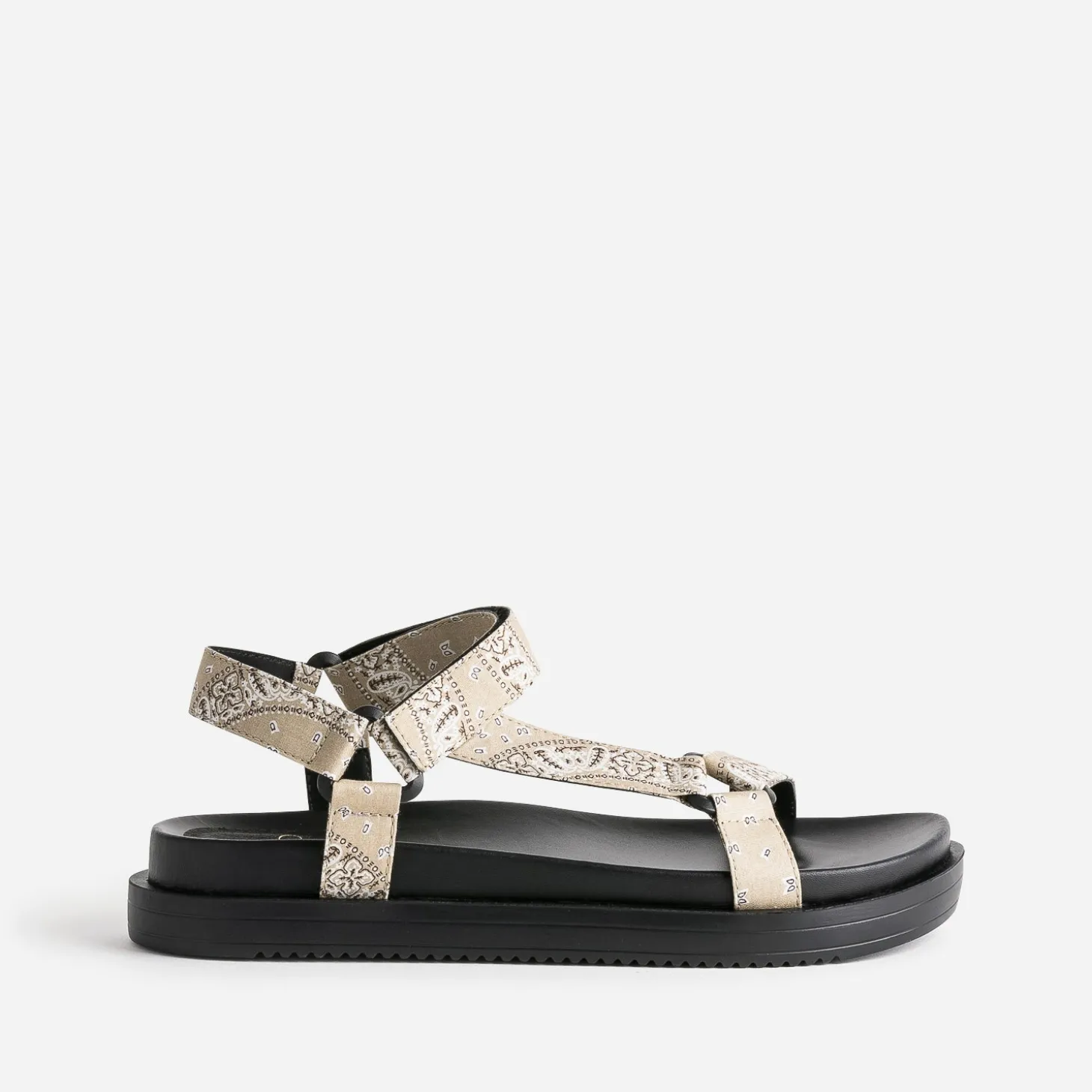 Inspiré par la sandale de trekking, ce modèle de Dad Sandals pour femme séduit d’abord par son confort. Ses brides spécifiques, fermées par scratch, sont recouvertes d’un tissu bandana vintage de couleur beige. Ultra stylée depuis plusieurs saisons, elle appelle un look décontracté, comme un tee-shirt blanc à col rond et manches courtes sur un pantalon large noir plissé.