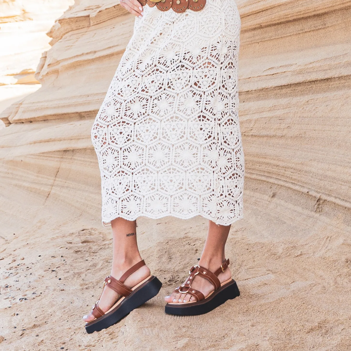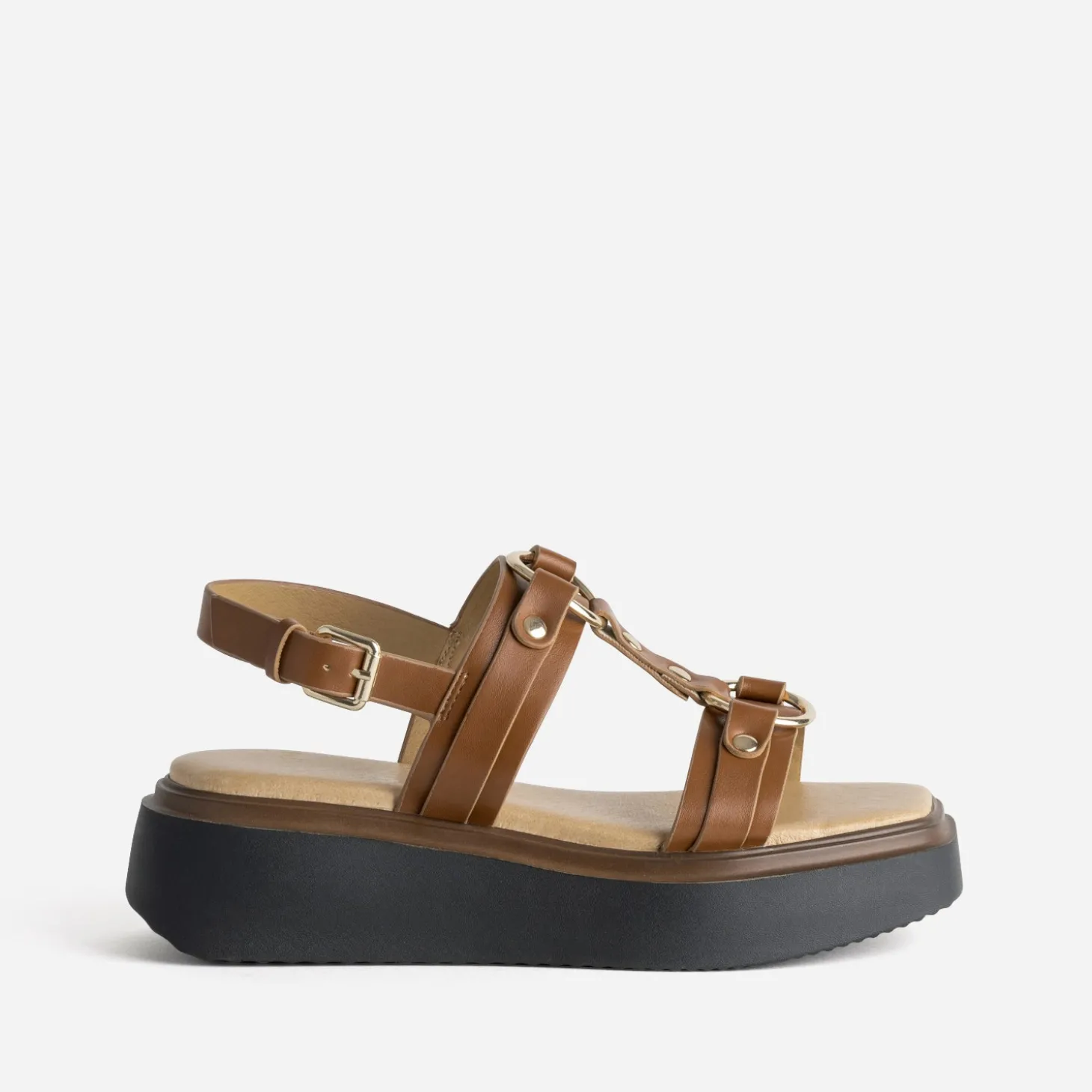Ne faites aucune concession sur le confort en plein été. Cette sandale pour femme est montée sur une semelle à plateforme lisse, surmontée d’une première moussée, pour minimiser les impacts de la marche. Les brides, en matière synthétique lisse cognac, sont reliées par une patte en T, maintenue par deux anneaux et des clous en métal jaune. Un modèle parfait pour le quotidien, avec une combinaison fonctionnelle, détournée d’un col claudine ou ceinturée à la taille, pour une vraie liberté de mouvements. Marque : TEXTO