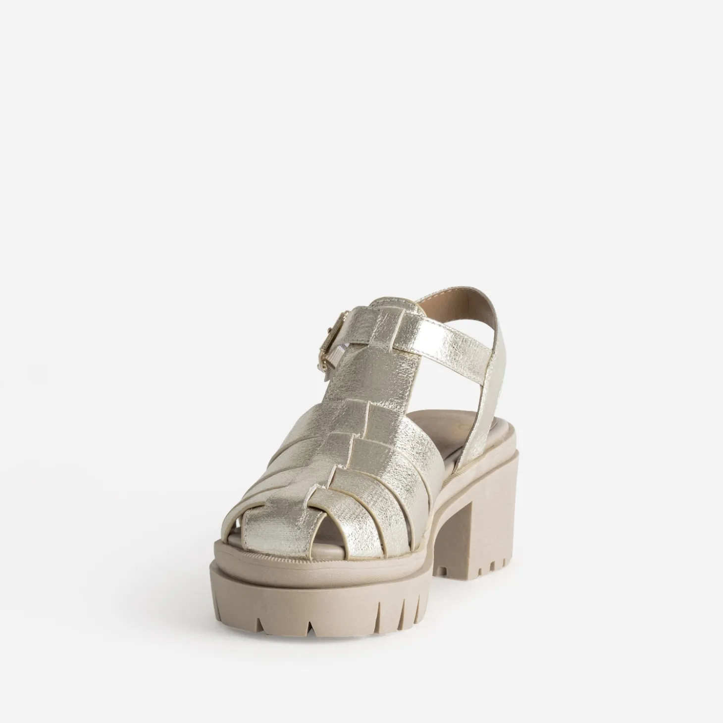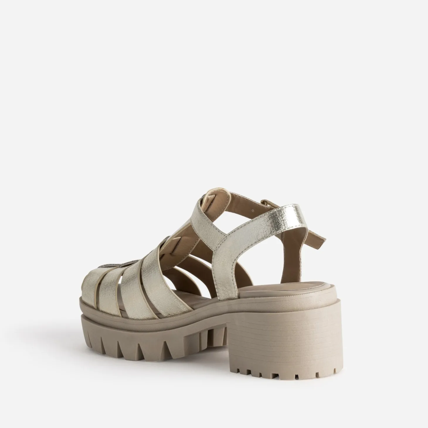 Plus massive, plus brillante, cette sandale femme s’inscrit dans la tendance actuelle. En matière synthétique, elle opte pour une forme fishermann, reconnaissable à ses multiples brides, et montée sur une semelle épaisse et crantée. Elle se décline dans un coloris métallisé doré, idéal pour apporter une touche casual chic aux looks du quotidien. Un modèle à associer avec un top fluide rouge corail et un jean large écru.