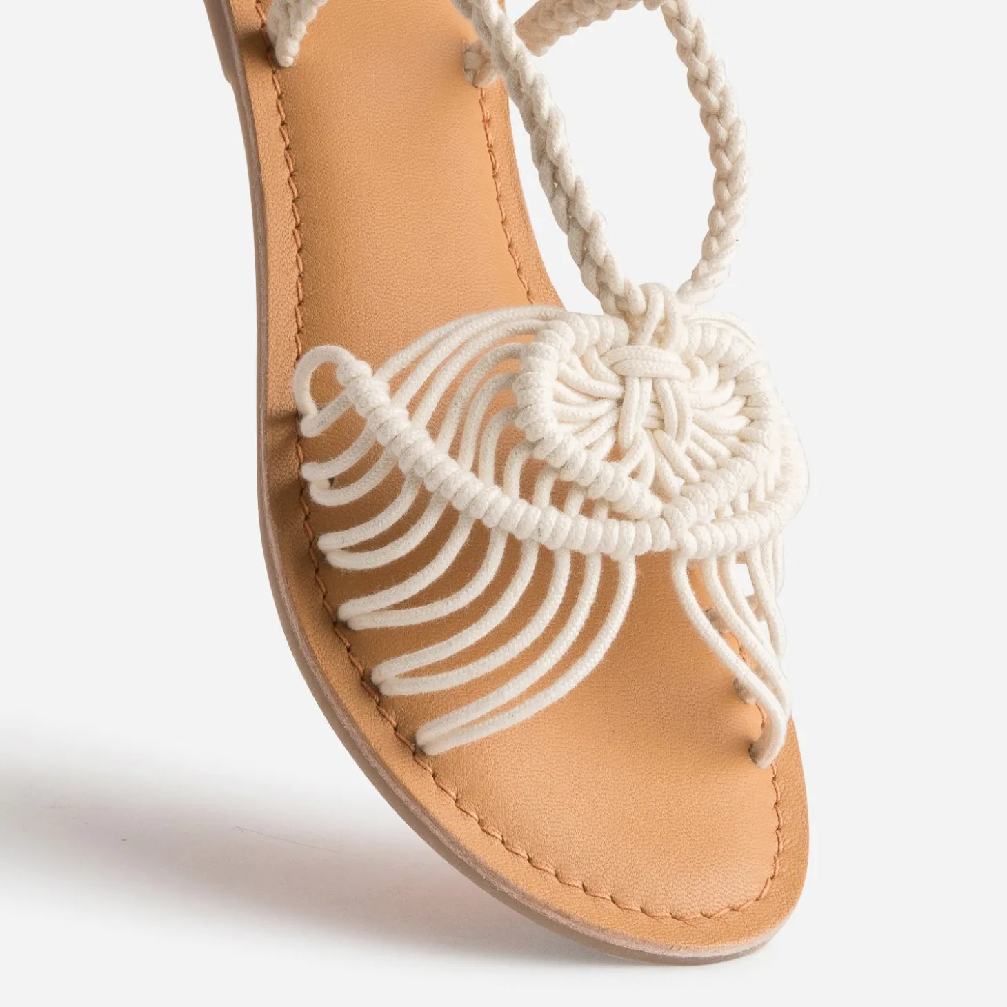 Style bohème est une tendance intemporelle, qui marque la saison estivale. Sur cette sandale plate pour femme, la bride principale est revisitée par un tissage en textile écru façon macramé, prolongé par une tresse autour de la cheville. Idéale avec une robe en broderie anglaise blanche, avec un panier en raphia en guise de sac à main.