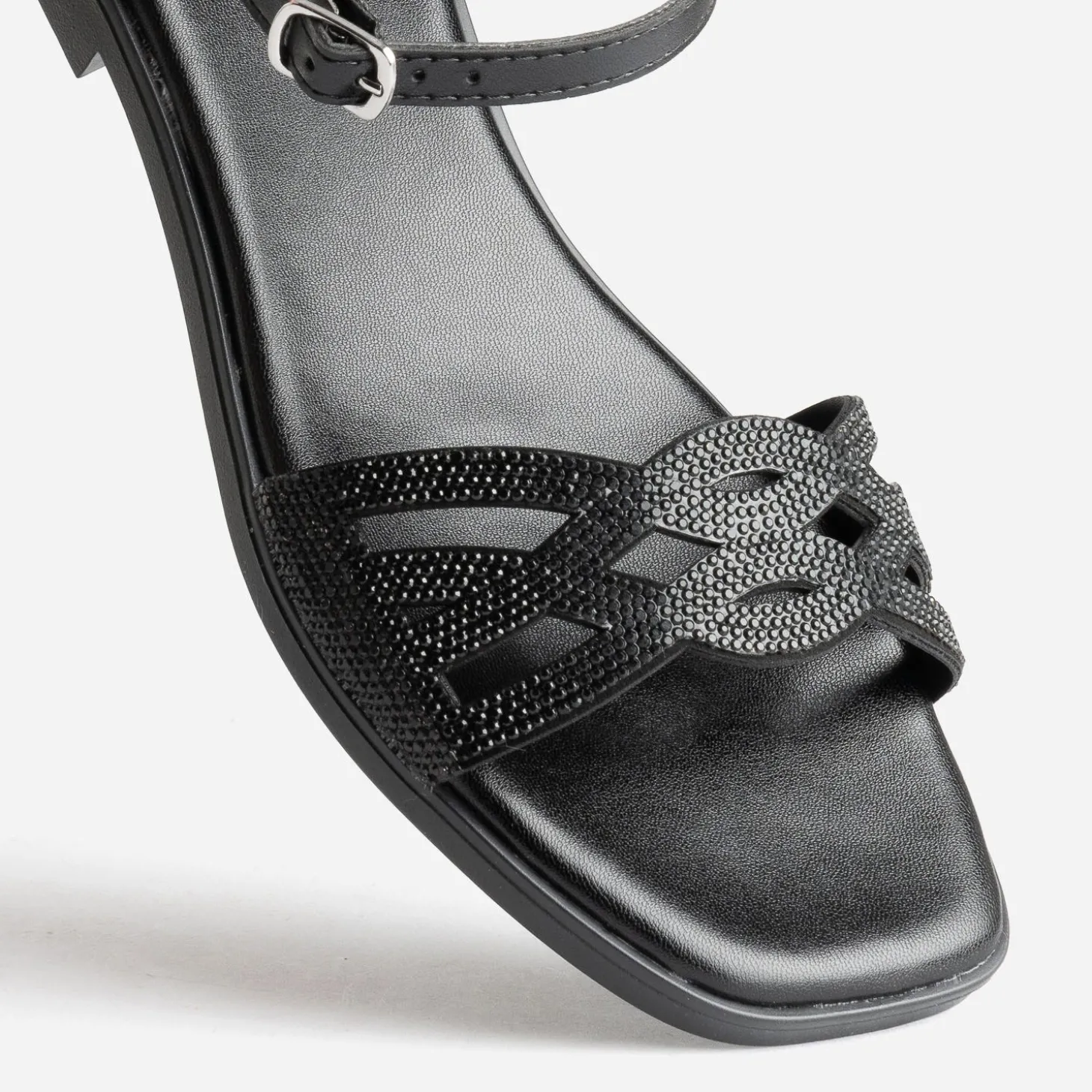 Une jolie sandale aux détails raffinés, et c’est toute la tenue qui gagne en chic. Plate, ce modèle noir présente une bride faite d’entrelacs et rehaussée de strass ton sur ton. Misez sur un total look black, costume-pantalon ou combi.