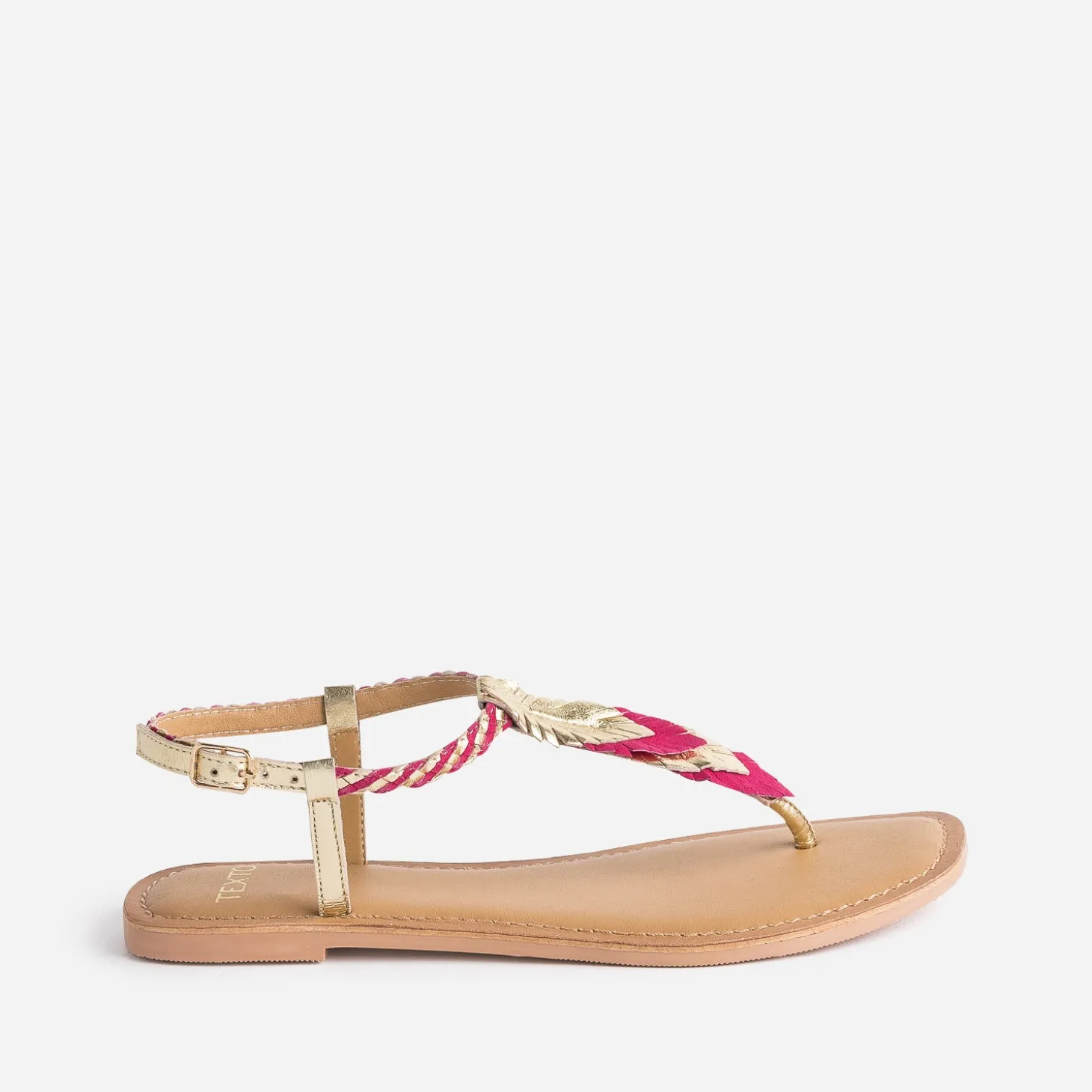 Sandale-tong TEXTO fuchsia et or en cuir à plumes
