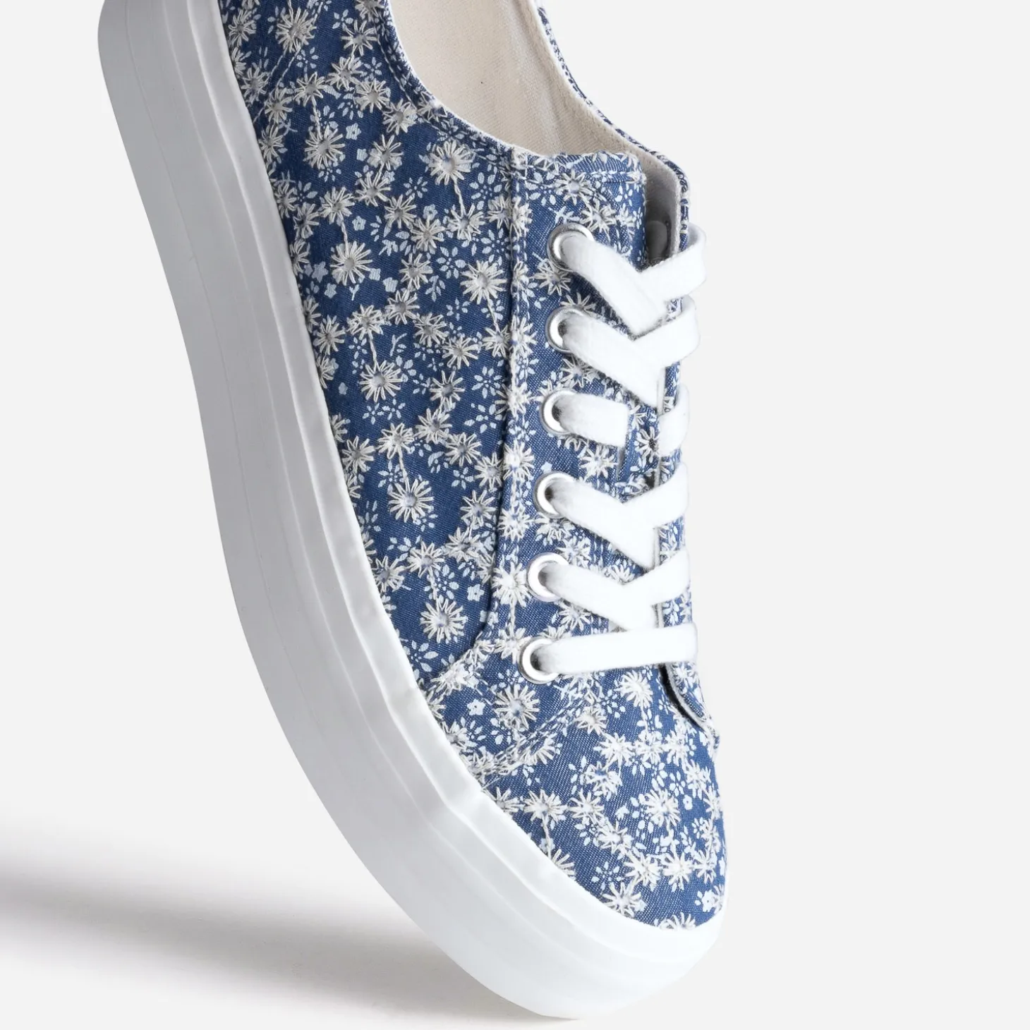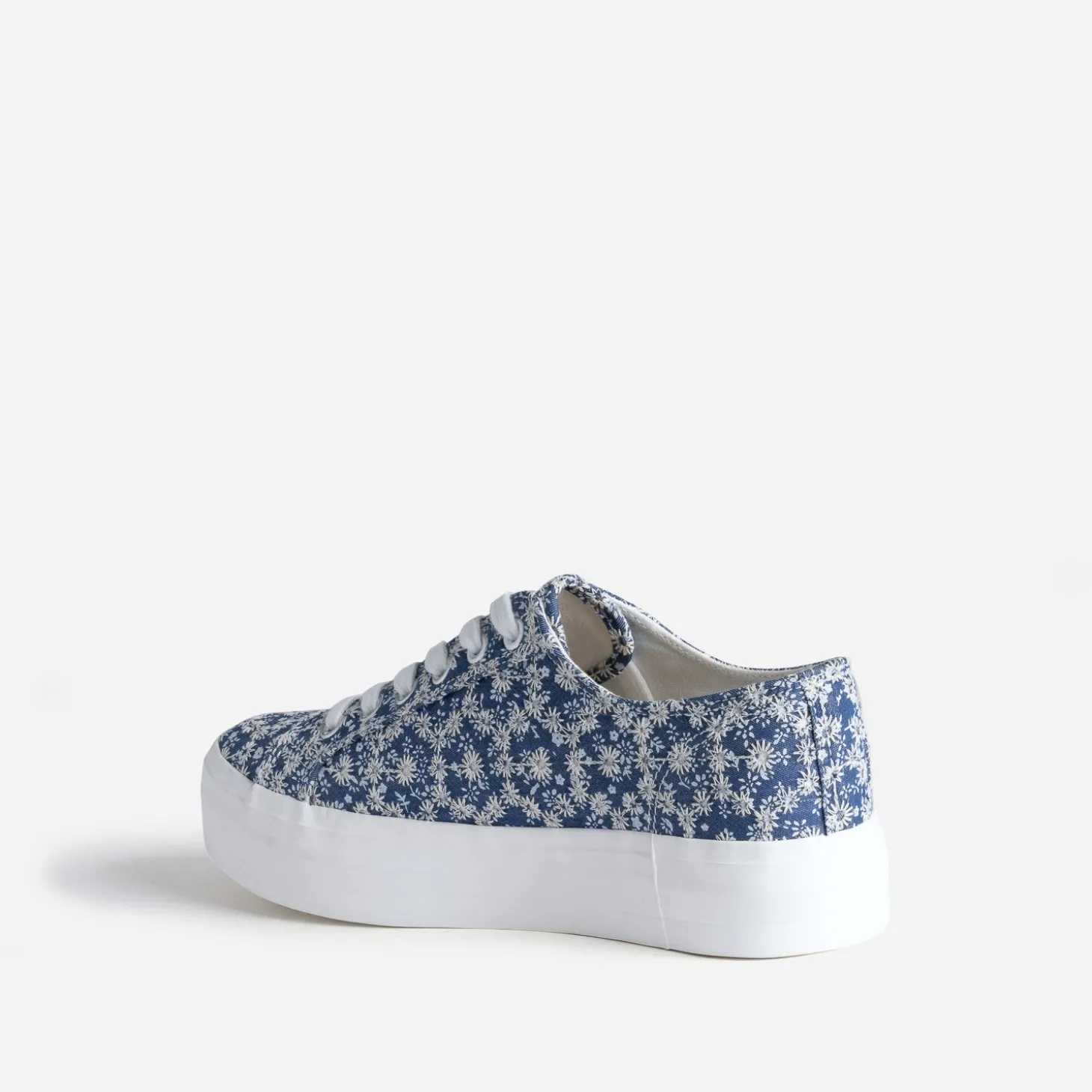 Ce bleu là, il est parfait. Inspiré du denim, revu par des broderies et un imprimé fleurs, il assure des looks décontractés. La tennis femme associe toile et semelle épaisse blanche, pour s’inscrire dans la tendance du moment. Un modèle à privilégier à l’entre saison, avec un tee-shirt, un jean cropped et une veste en jean.