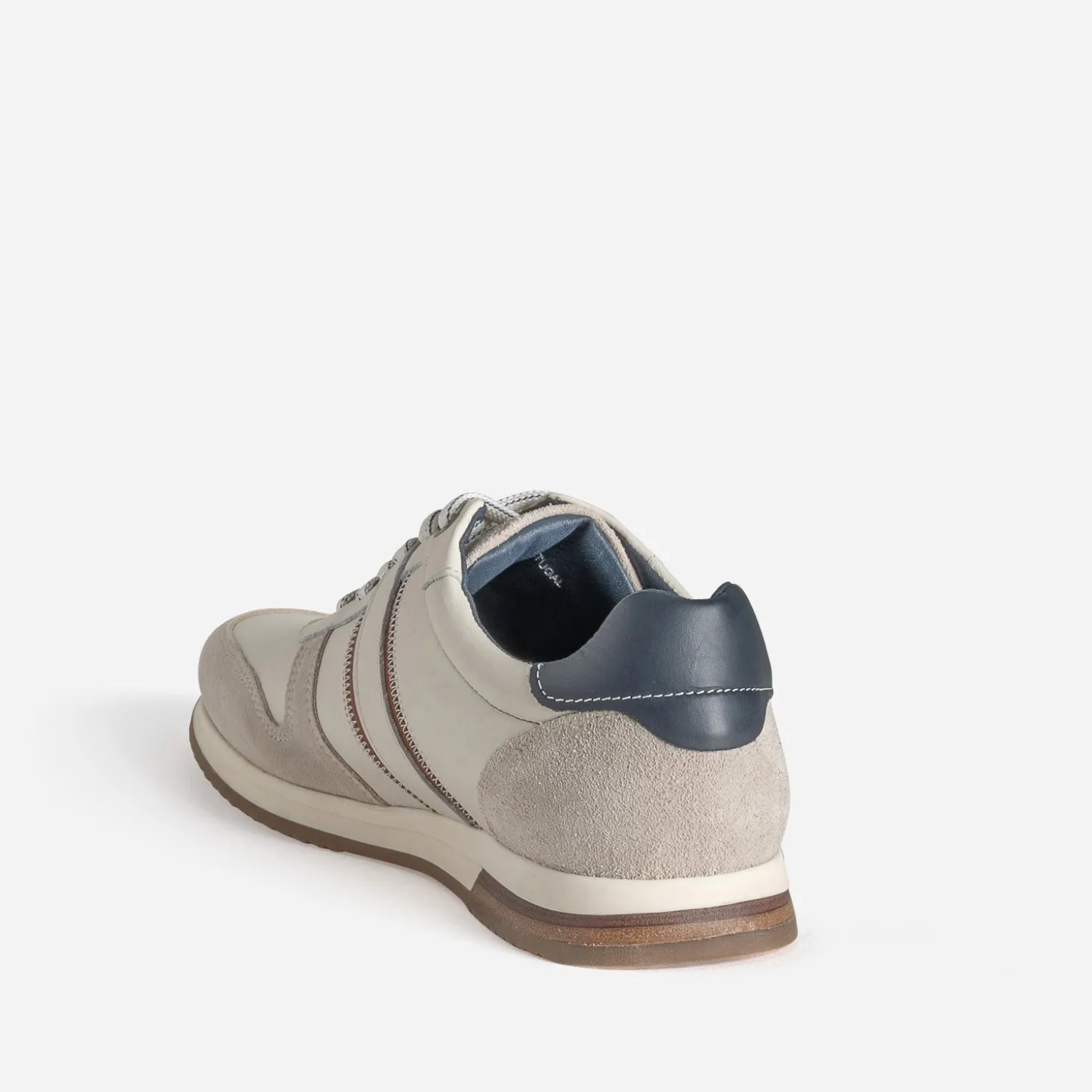 Mélange de cuir et cuir velours, la tennis pour homme s’offre une nouvelle interprétation. Beige clair, marron et bleu marine, elle associe des couleurs dans une belle harmonie. La semelle intérieure est amovible, afin d’y glisser une semelle plus adaptée et gagner en confort. Un modèle à privilégier avec une tenue décontractée, polo beige et pantalon chino ou bermuda bleu marine.