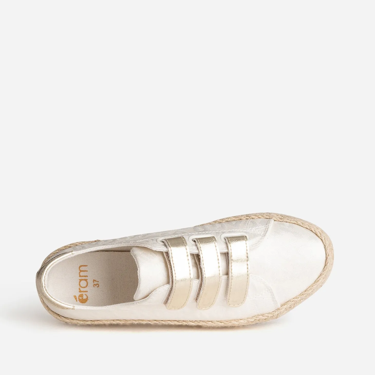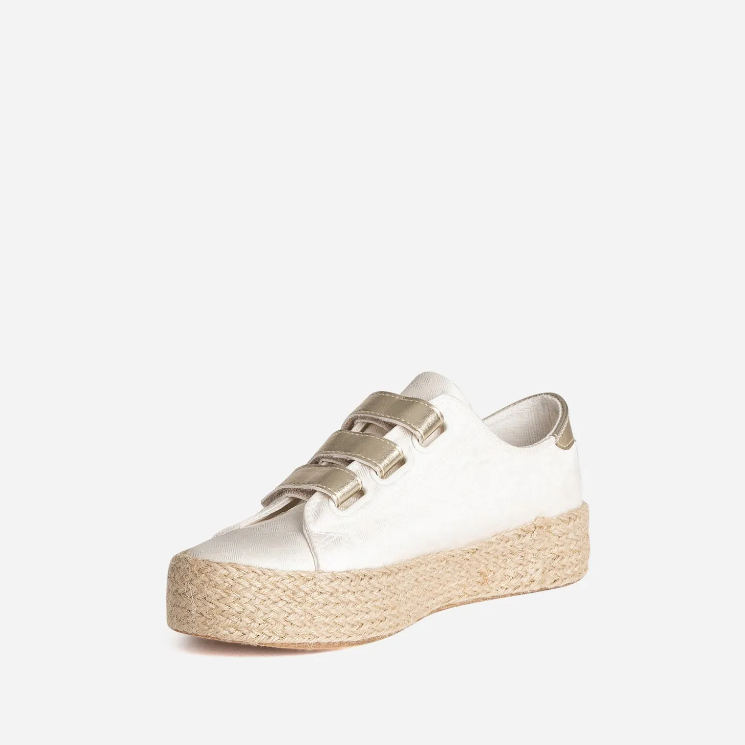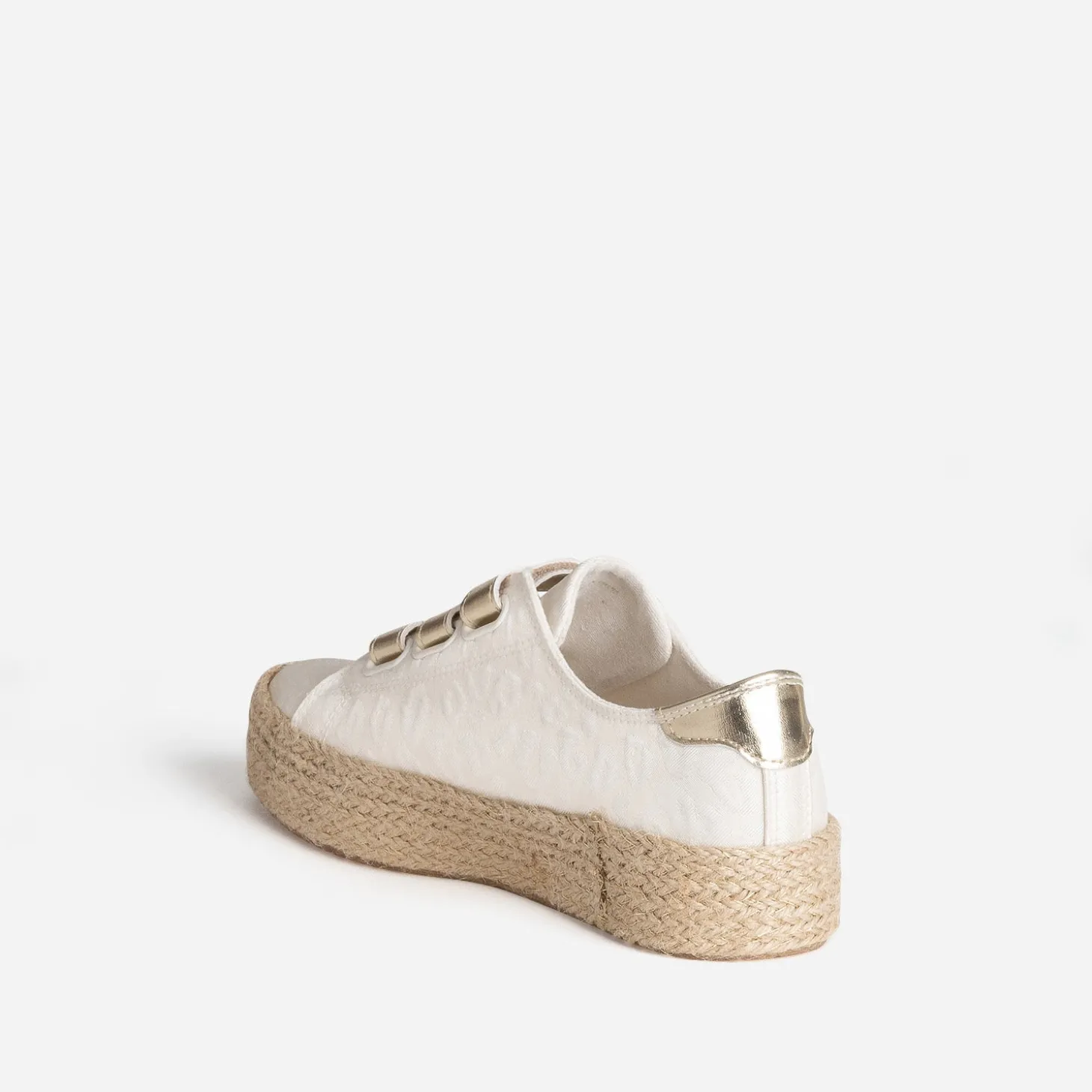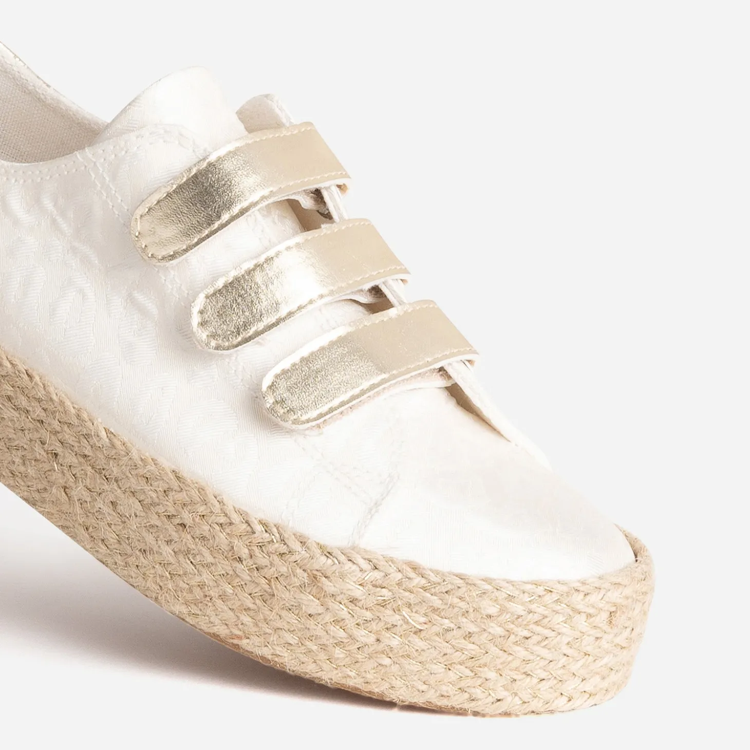 Tige inspiration tennis, semelle inspiration espadrille : faites de la place pour cette sneakers, parfaite pour le printemps. En textile blanc cassé, elle se démarque par un jacquard à motif léopard et une semelle à plateforme de 3 cm recouverte de corde et de fils dorés. Sa particularité : elle se ferme par trois scratchs dorés. Un modèle à porter au quotidien, avec un top blanc, un jean cropped bleu et une ceinture marron.