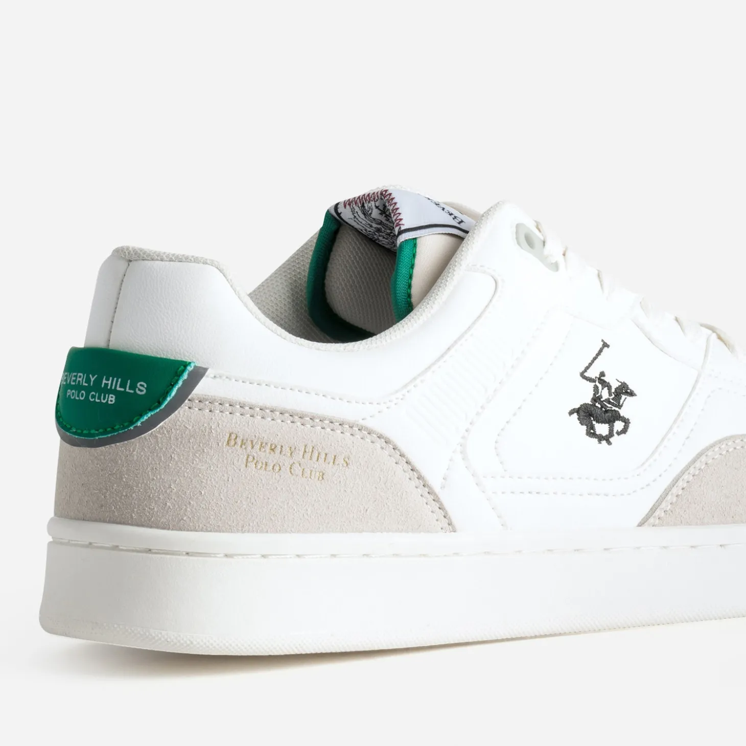 Cette tennis pour homme est une proposition simple, dans l’air du temps. En matière synthétique lisse, elle est soulignée de détails beiges et d’un contrefort vert vif. Les logos rythment la languette par une étiquette tissée, le côté par une broderie, l’arrière par un marquage métallisé. Un modèle à préférer avec une tenue décontractée, polo blanc et pantalon chino beige.