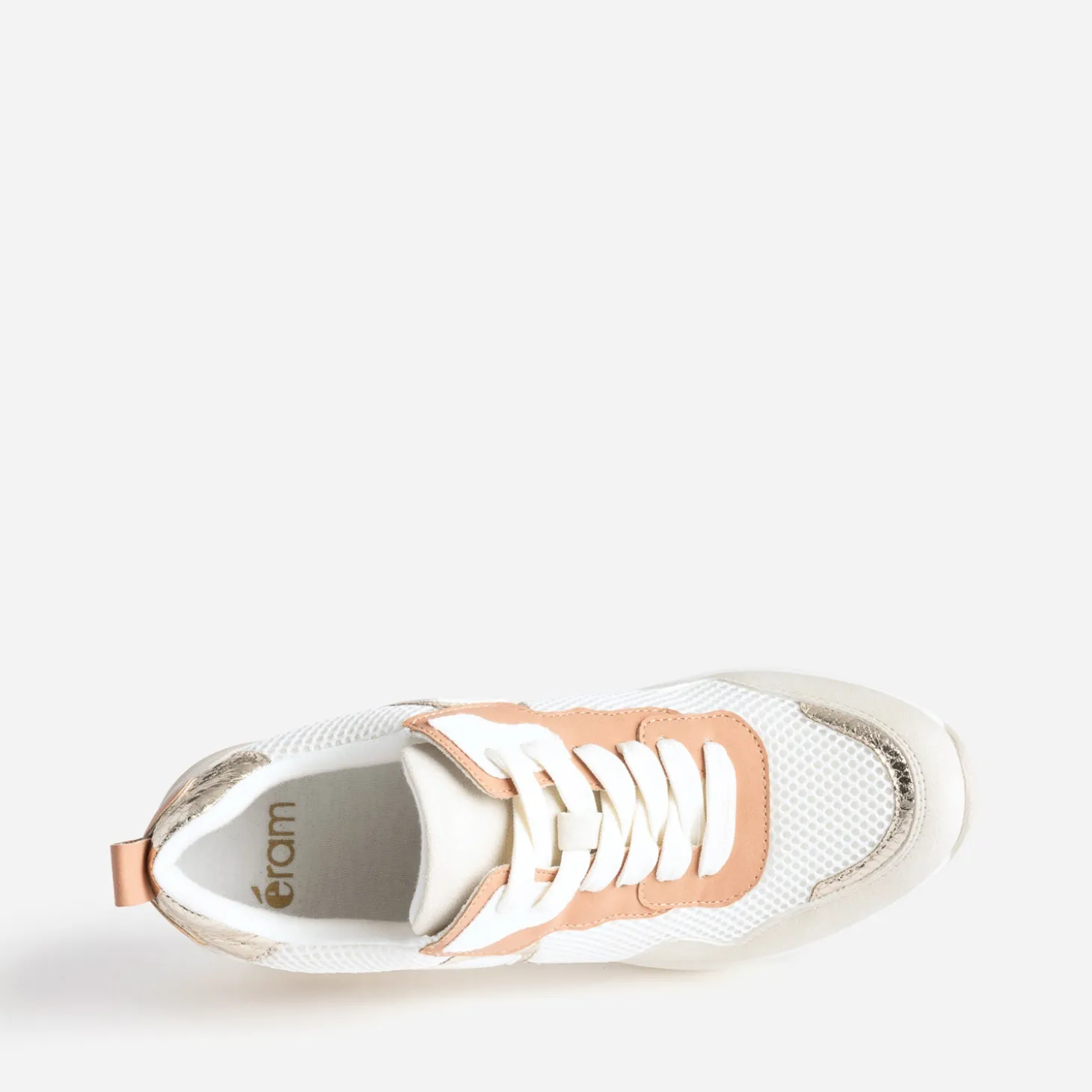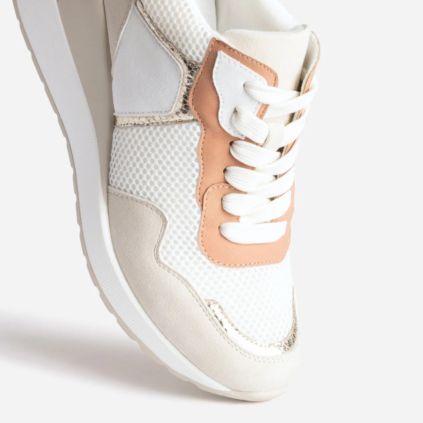 Talon compensé et semelle première amovible : le combo gagnant pour une tennis toujours plus confortable au porté. Blanc, beige, terracotta s’accordent dans une harmonie douce et facile à vivre. Mesh et matières suédées se laissent bousculer par des touches dorées effet python. Le look à composer ? Top blanc, pantalon cropped en lin beige ou terracotta, sans oublier les accessoires dorés.