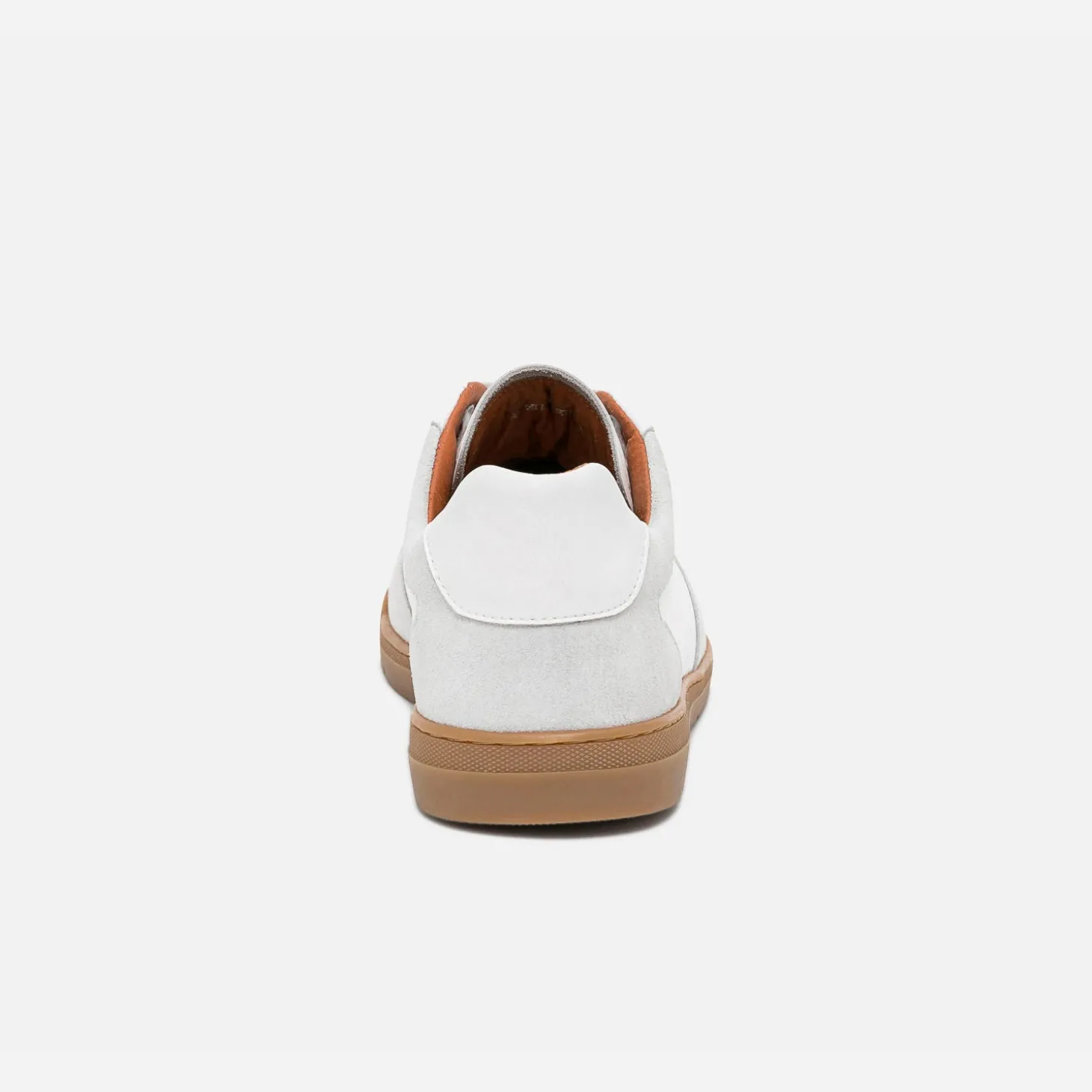 100% cuir blanc, cette tennis pour homme se laisse bousculer par des empiècements en cuir velours gris clair. La doublure et la première en cuir camel font écho à la semelle extérieure contrastée. Un modèle idéal en toutes saisons, avec un look chic comme plus décontracté.