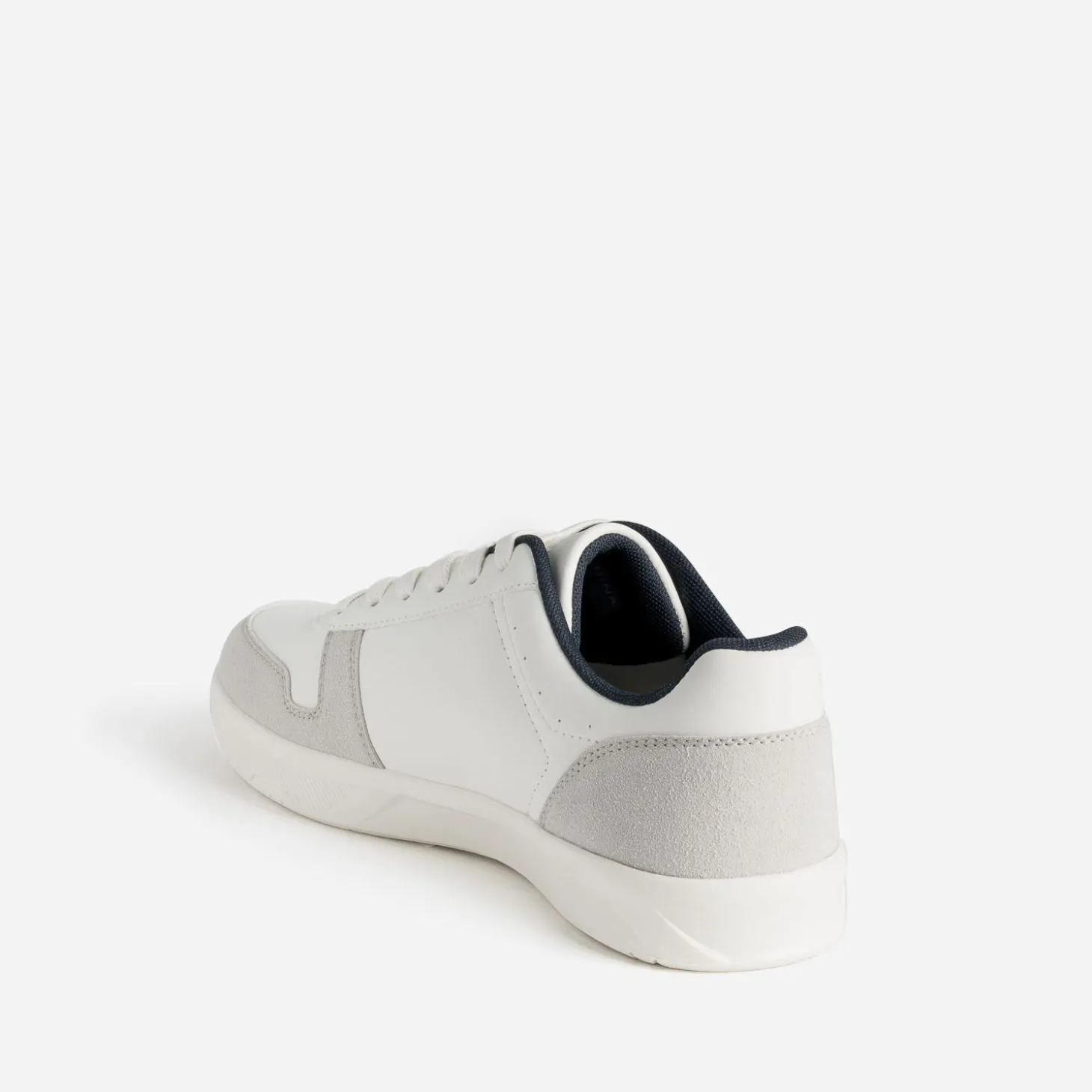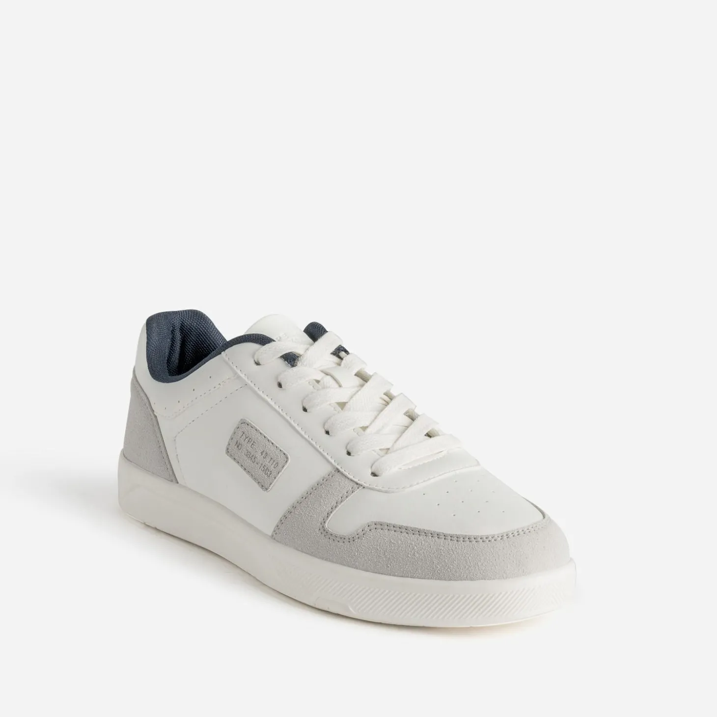 Matière synthétique lisse blanche, matières synthétiques suédées gris clair, doublure bleu marine : cette tennis pour homme s’inscrit dans une tendance sportswear modérée. Elle se porte facilement avec un tee-shirt blanc et un jean gris, pour un look du quotidien.