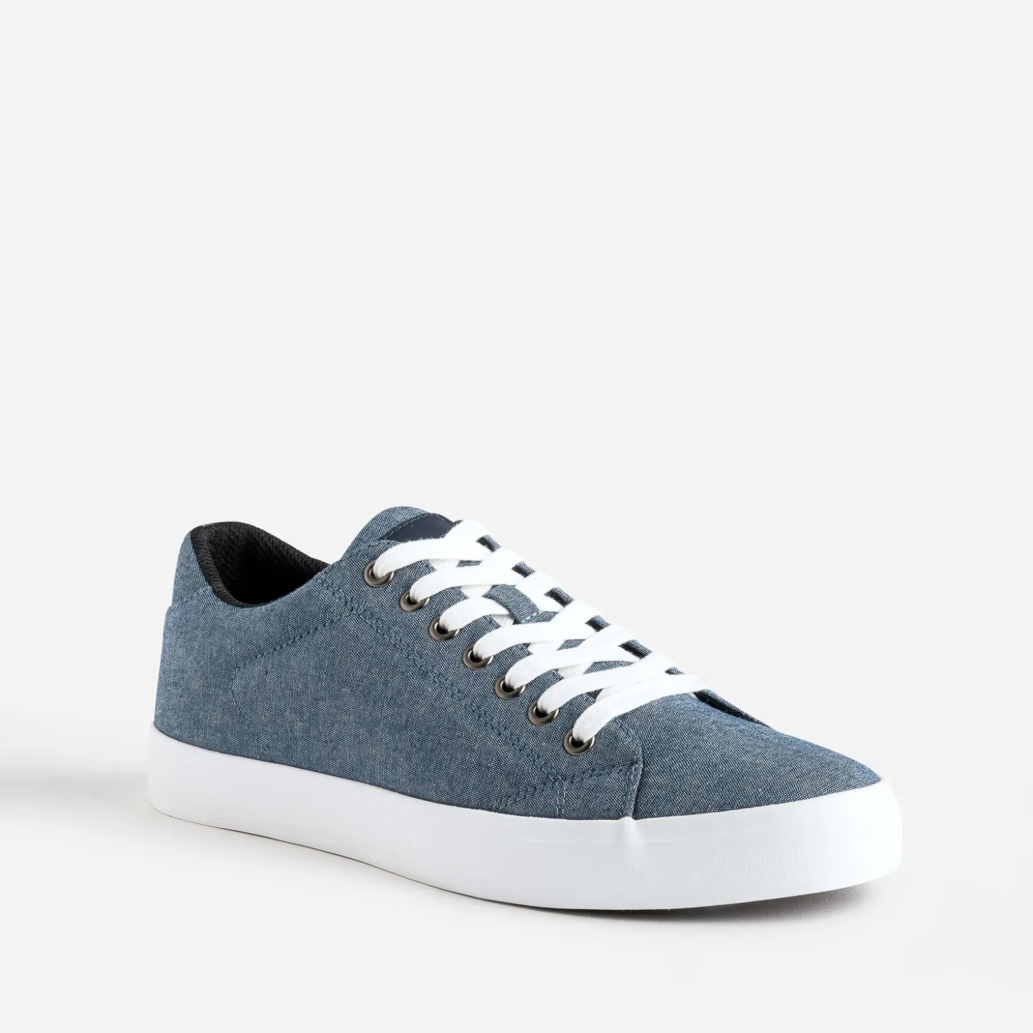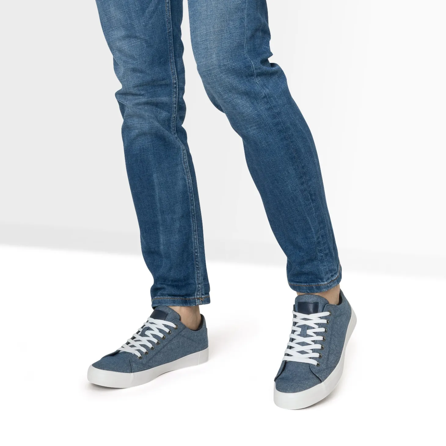 Inspiration chambray pour cette tennis en toile bleu chiné pour homme. Elle se ferme par un lacet plat blanc, en écho à la semelle. La doublure intérieure, elle, se décline en coloris noir. Les pièces en jean, chemise, pantalon, veste, sont ses meilleures alliées.