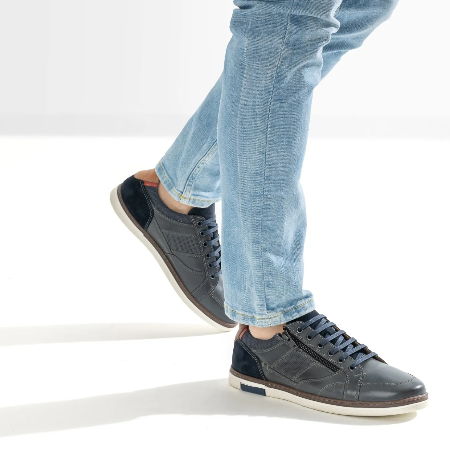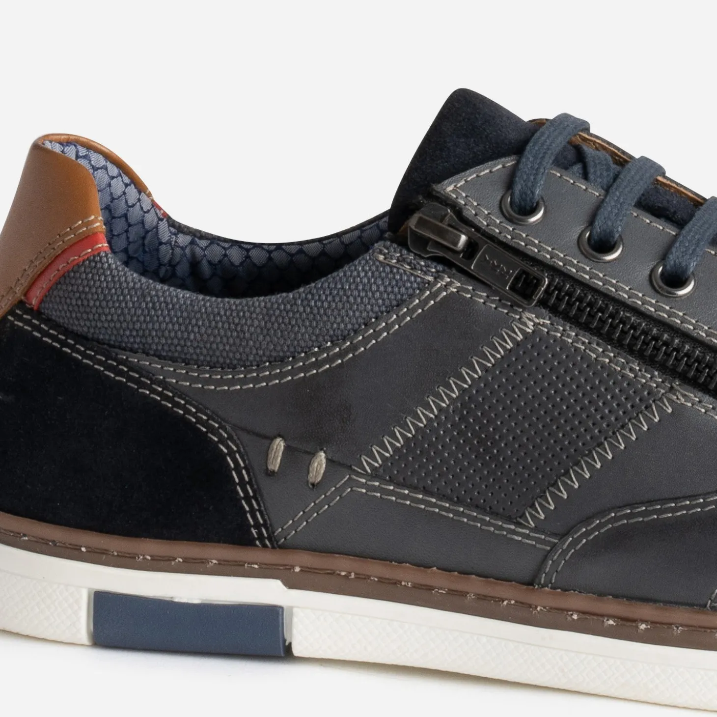 Cette tennis pour homme séduit par son cuir bleu marine, sobre, intemporel. Elle se démarque par des découpes placées avec embossage perforé sur les côtés, par des empiècements en cuir velours ton sur ton et par un contrefort cognac. La doublure est imprimée, et le double système de fermeture par lacet et zip, facilite le chaussant. Un modèle idéal avec tous vos looks du quotidien.