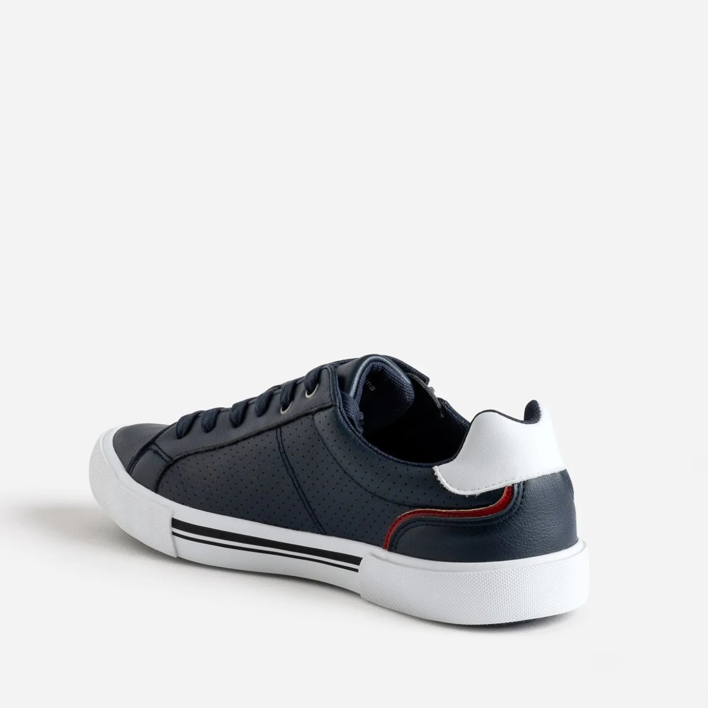 Double fermeture par lacet et zip extérieur. Jeu de perforations sur les côtés. Détails rouges sur le contrefort et la semelle. Double rayure sur la semelle. Cette tennis homme en matière synthétique bleu marine mise sur les détails pour faire la différence. Un modèle casual, pile dans l’air du temps.