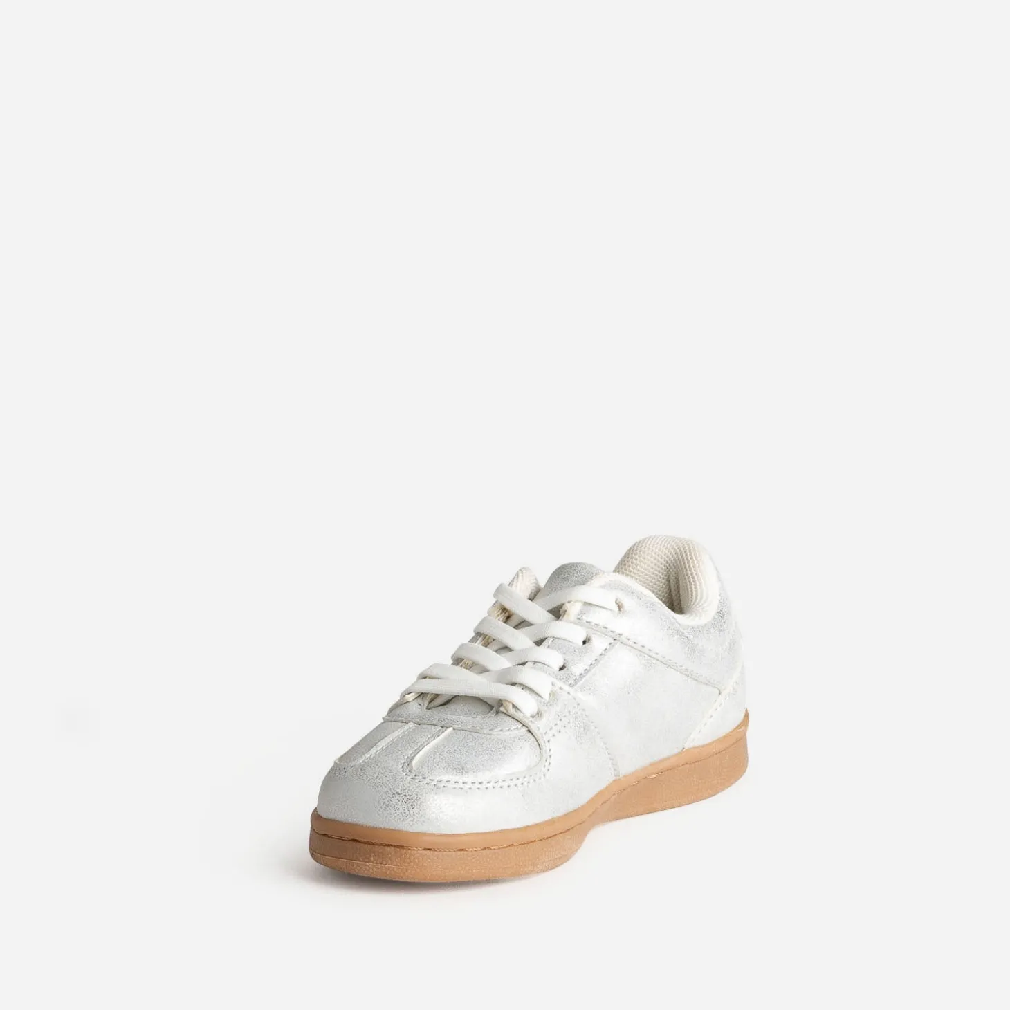 Pile dans la tendance, cette tennis n’a qu’un seul objectif : chausser les petites filles avec confort et style. En matière synthétique, elle se décline en coloris argenté, avec une finition brossée. Rythmée de découpes, elle est montée sur une semelle camel. Un modèle très actuel, qui s’accorde facilement avec des couleurs froides, comme le bleu, le vert ou le violet, et bien sur, le blanc et le gris.