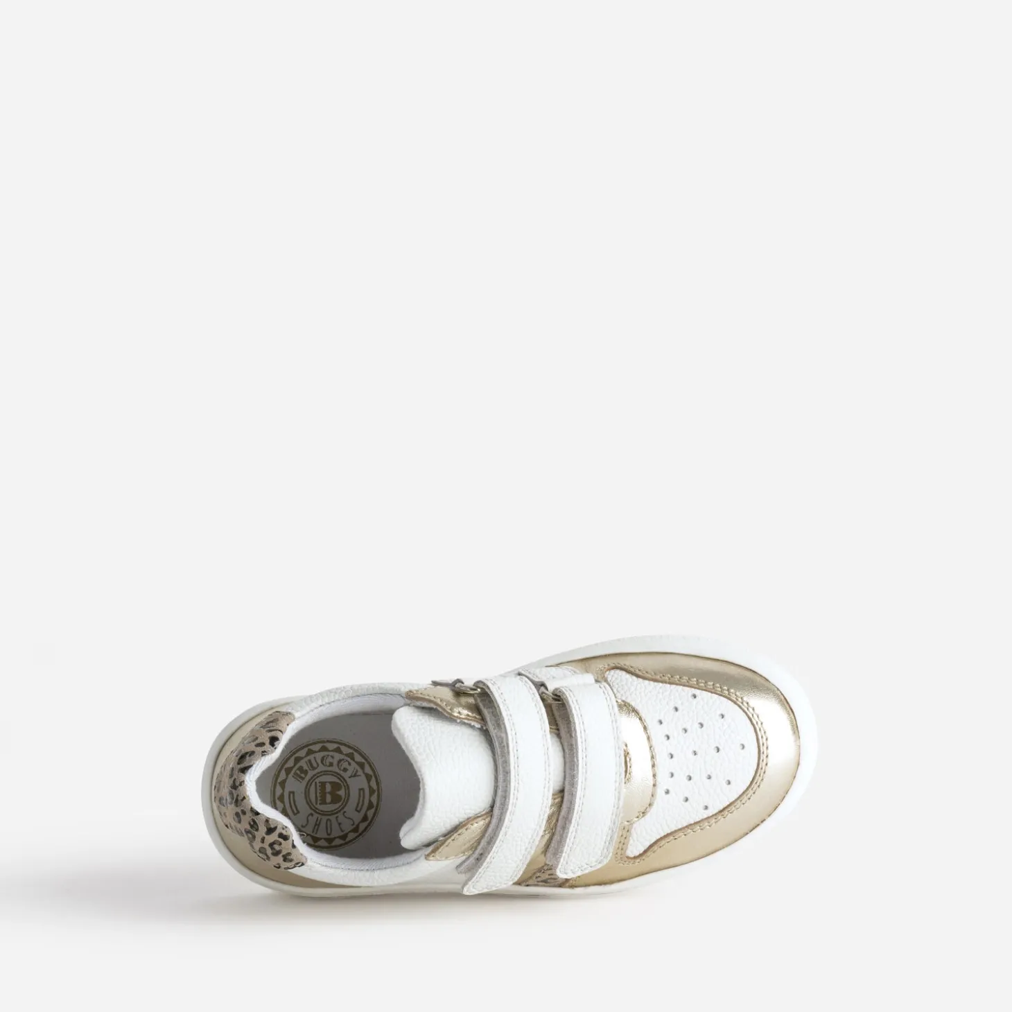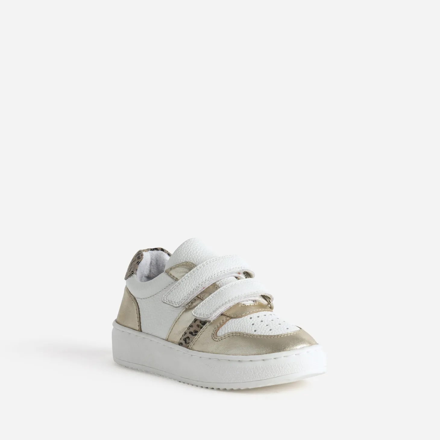 Dublanc, du doré, du motif léopard. Nouveau trio à suivre, de la cour de récré aux fiestas programmées. Une tennis tout cuir qui va forcément plaire aux petites filles. Elle se ferme par scratchs, pour les accompagner dans leur autonomie. Un modèle facile, tant avec un total look denim qu’avec un combishort kaki.