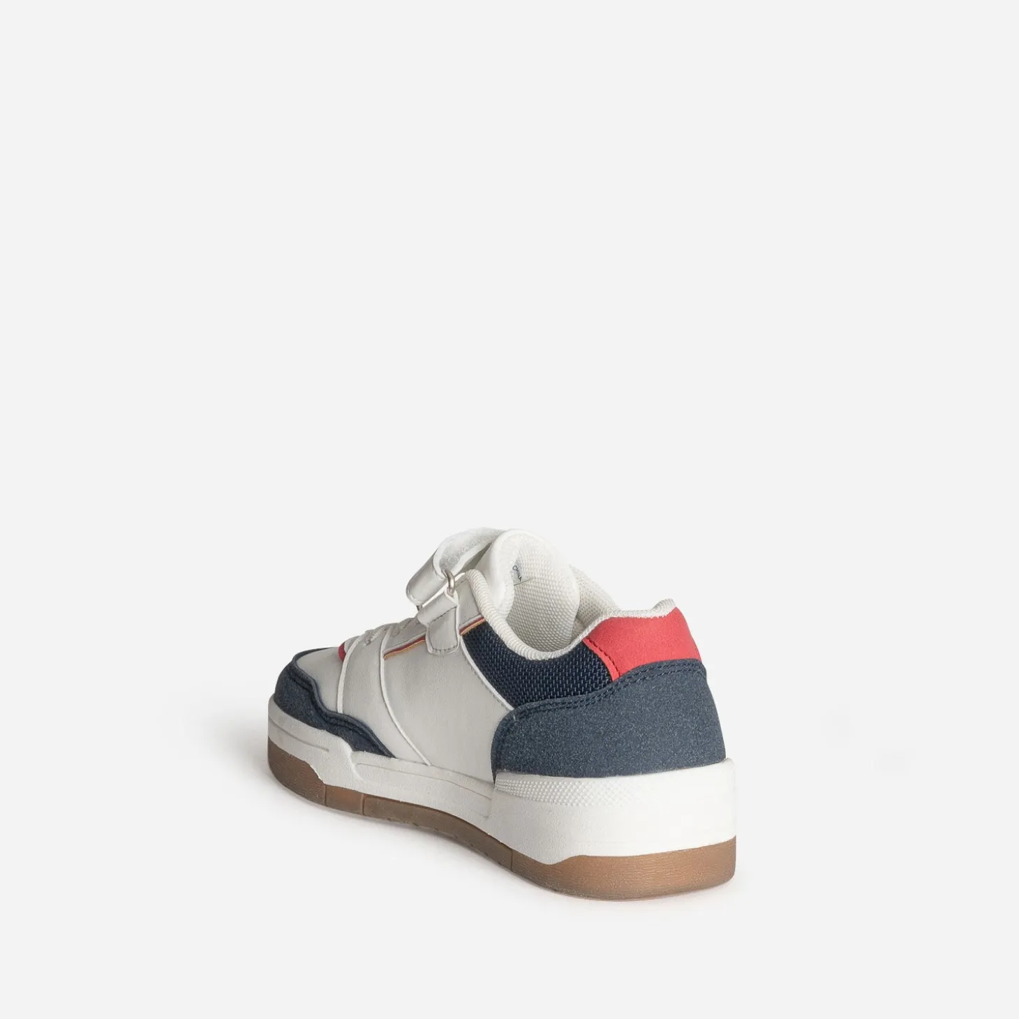 Blanc, bleu, rouge : le trio reprend du service sur une tennis enfant, pile dans l’air du temps. Perforations, jeux de découpes, associations de matières, lacet élastiqué et scratch, elle affirme son style, sans perdre en confort. Un modèle mixte, à accorder avec un sweat et un jean.