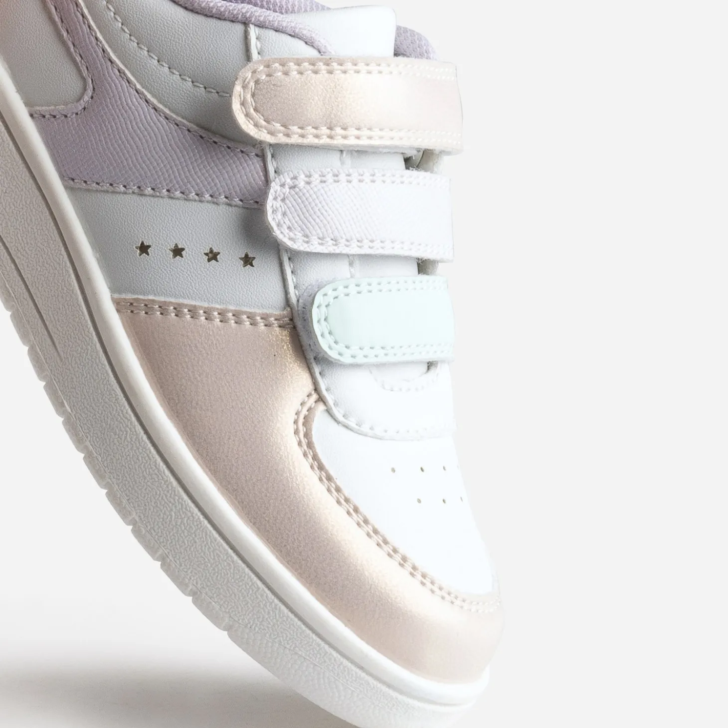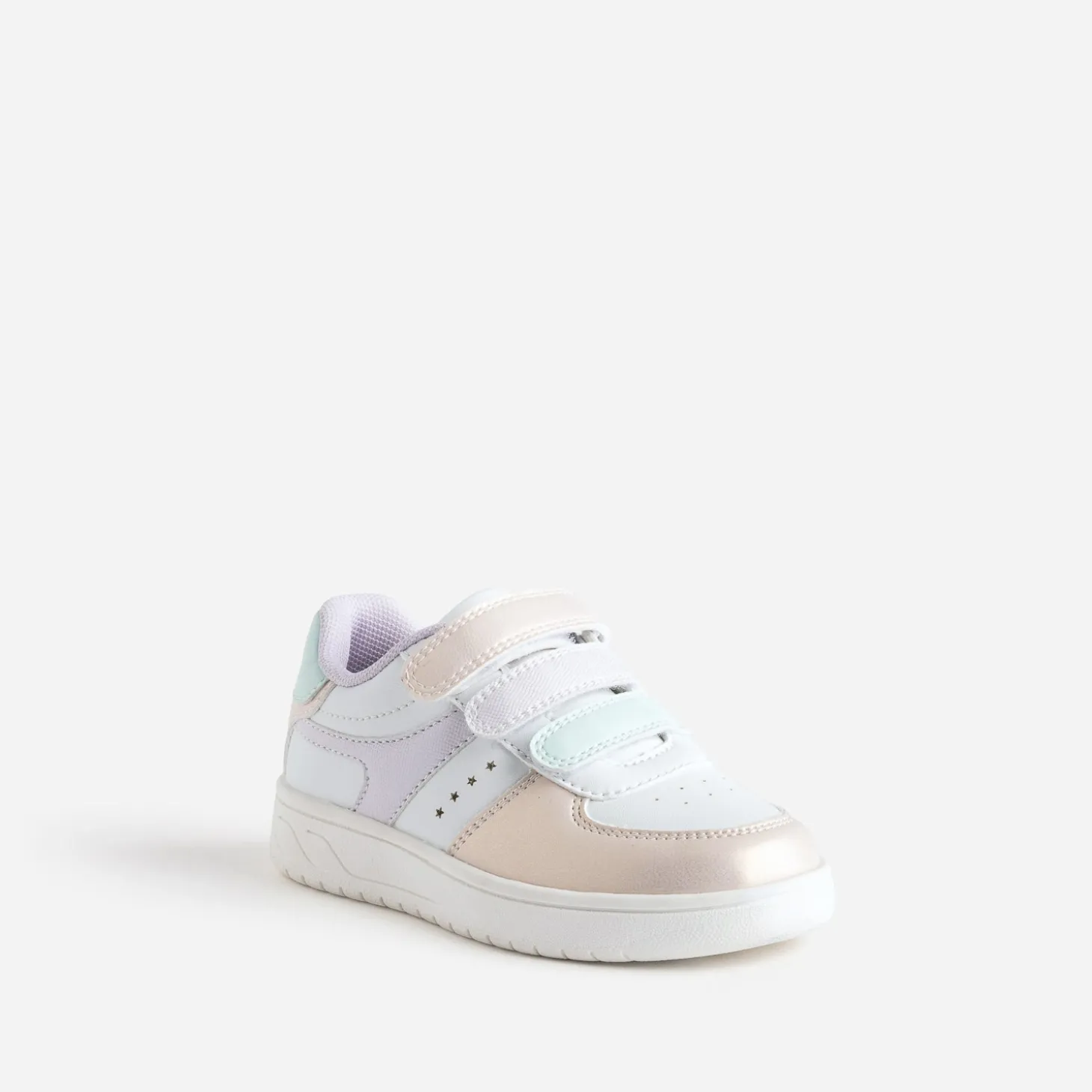 Couleurs pastel inspiration sirène, finition irisée, perforations et découpes étoiles : la tennis mise sur les détails girly pour plaire aux petites filles. Elle se ferme par 3 scratchs pour les accompagner dans leur autonomie. Un modèle idéal avec du vert d’eau ou du parme, du blanc ou du rose poudré, ou un total look denim bleu ciel.
